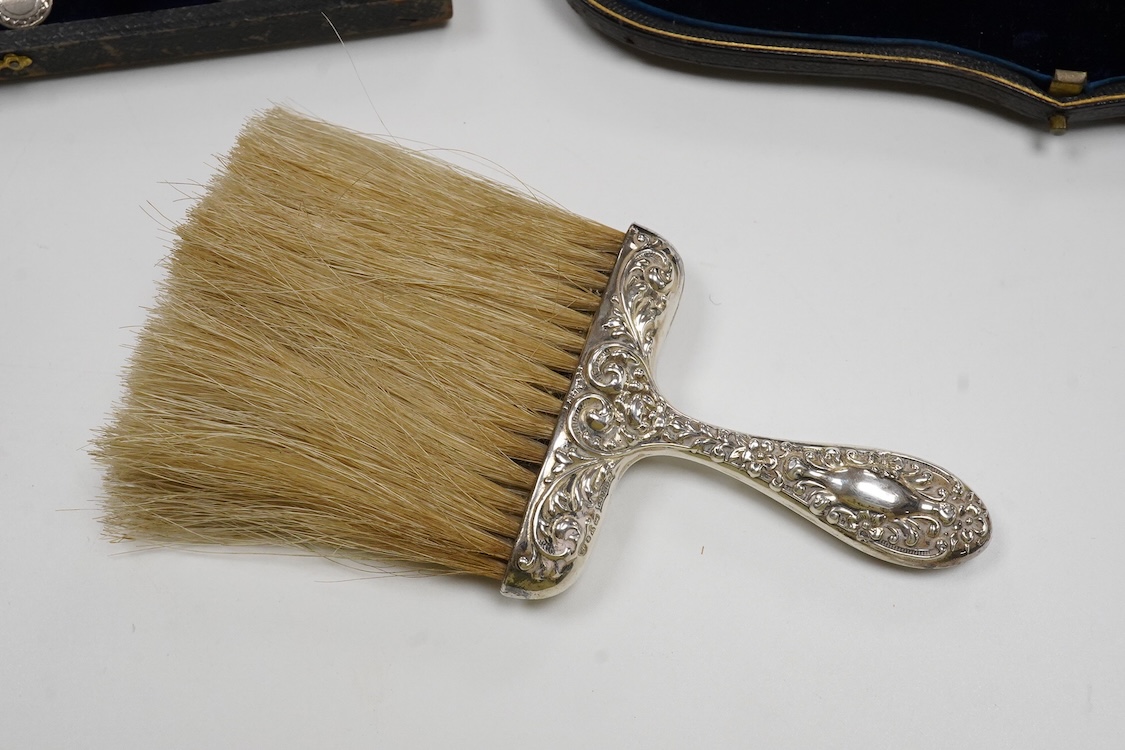 A cased set of six late Victorian engraved silver teaspoons with sugar tongs, Wakely & Wheeler, London, 1892, together with eight other silver teaspoons and a silver handled crumb brush.