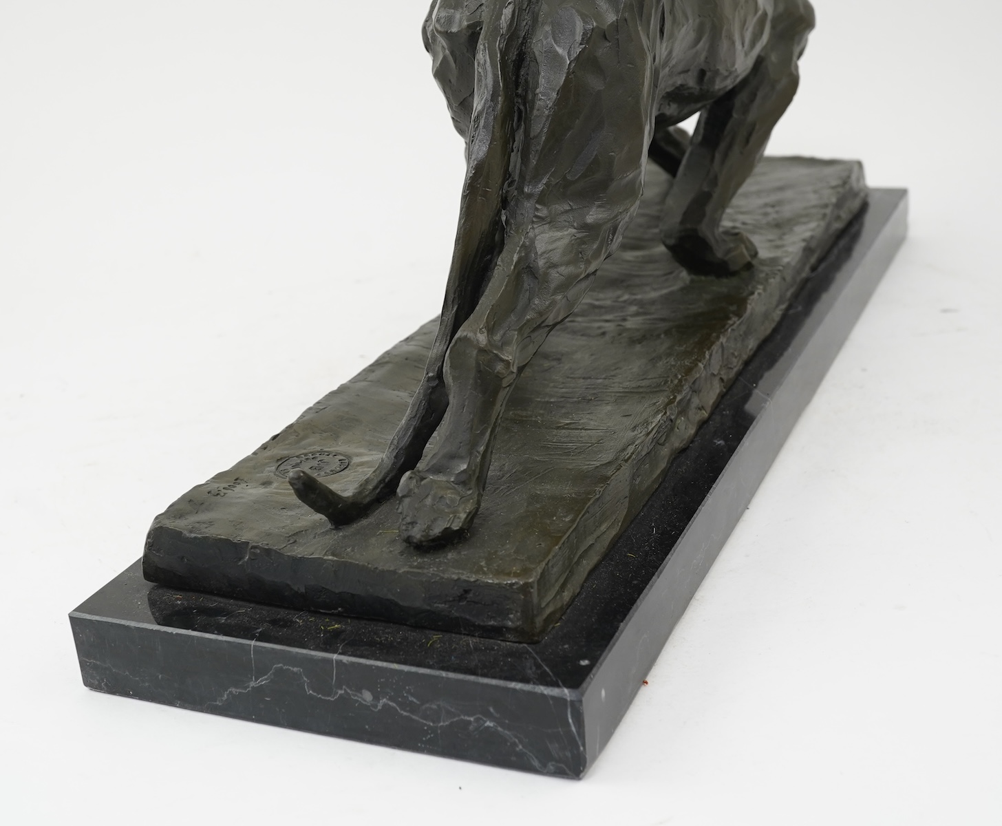 After Rembrandt Bugatti (Italian, 1884-1916): A patinated bronze of a prowling panther, inscribed "2006.3" to the naturalistic base, "Bronze Garanti Paris J.B. Deposee" foundry stamp, raised on a rectangular black marble base, 52cm wide overall