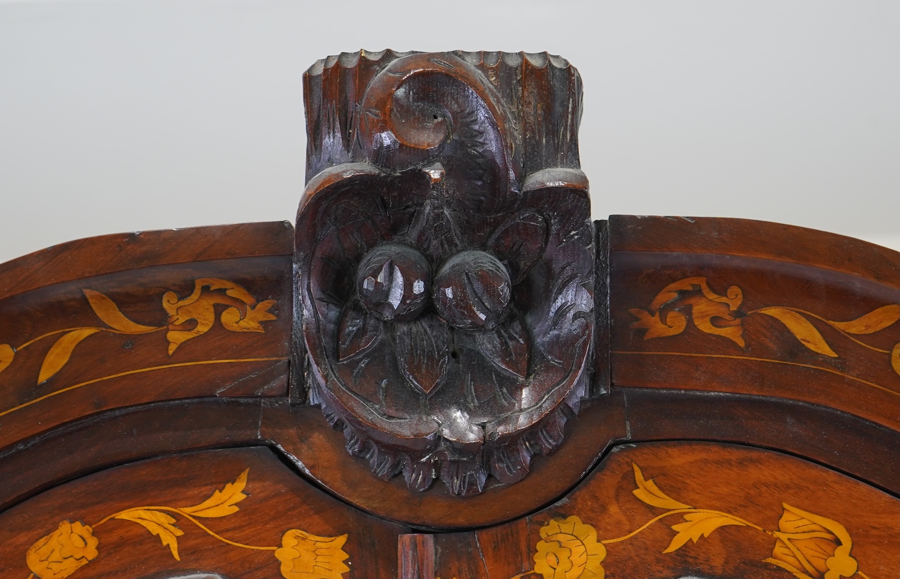 A late 18th/early 19th century Dutch floral marquetry walnut display cabinet, the arched carved pediment over two glazed, barred doors and panelled cupboard base on bun feet. 168cm wide, 34cm deep, 232cm high.