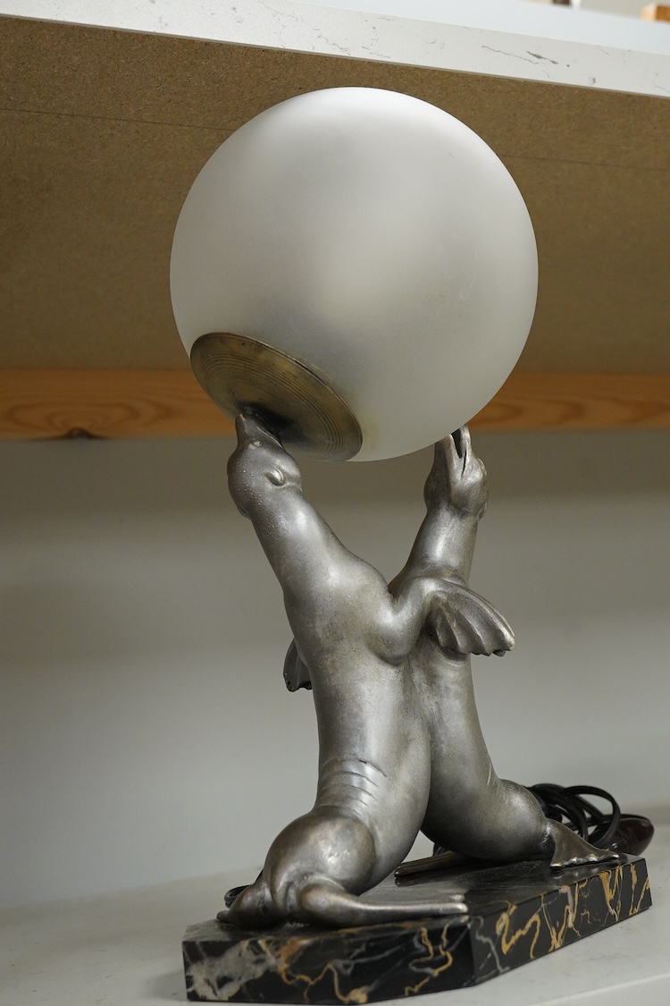 After Louis Carvin (French, 1875-1951) a twin seal lamp with circular frosted glass shade, 34cm high