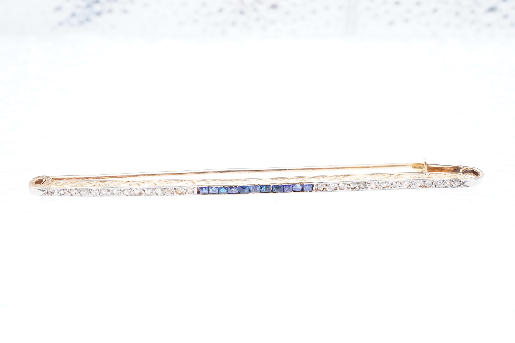 An Art Deco diamond and sapphire bar brooch, France, early 20th century, set with rose-cut diamonds and calibré-cut sapphires, the sides with engraved scrollwork, mounted in gold, length 8.7cm, French assay marks for 18ct gold, gross weight approximately 6.4 grams