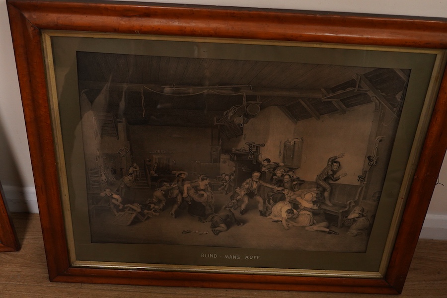 A set of three maple framed 19th century prints comprising 'Blind man's buff', 'Rent day' and 'The Village Festival' together with two others 'Day Dream' and 'Bound for Trafalgar Bay', largest 57 x 81cm