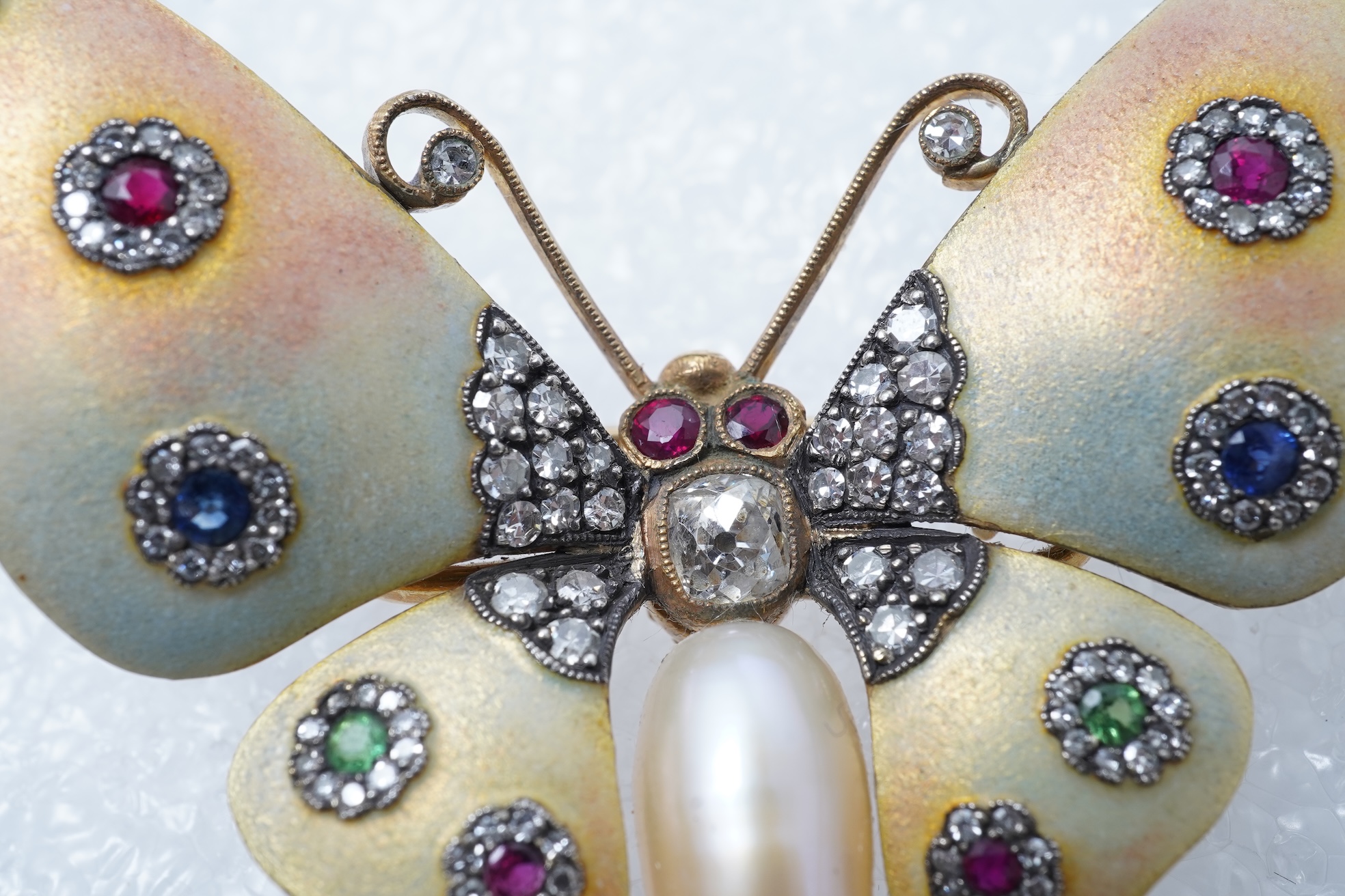 A fine and unusual gem-set, pearl, enamel and diamond butterfly brooch, circa 1900, its thorax set with a cushion-shaped diamond weighing approximately 0.30 carats, its eyes set with circular-cut rubies, a pearl measuring approximately 7.4 x 7.4 x 12mm forming its abdomen, its wings applied with iridescent enamel with a matte finish, set with clusters of cushion-shaped rubies, demantoid garnets and sapphires, within borders of single-cut diamonds, mounted in gold and platinum, wingspan 6cm, gross weight approximately 19 grams