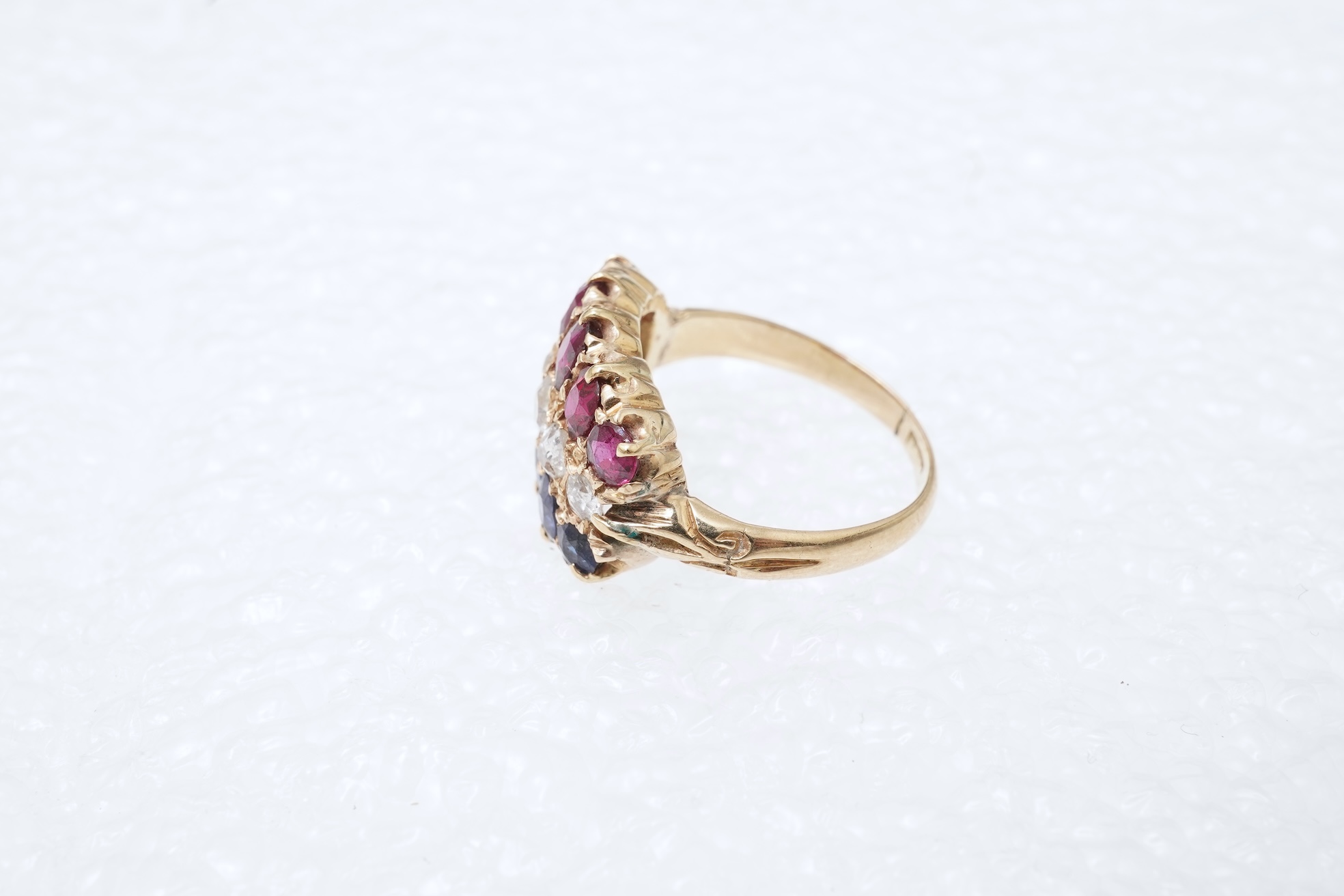 A ruby, sapphire and diamond ring, late 19th century, set with a sequence of circular-cut diamonds totalling approximately 0.35 carats, between bands of cushion-shaped sapphires and rubies, mounted in gold, size K, indistinctly marked, gross weight approximately 4.4 grams