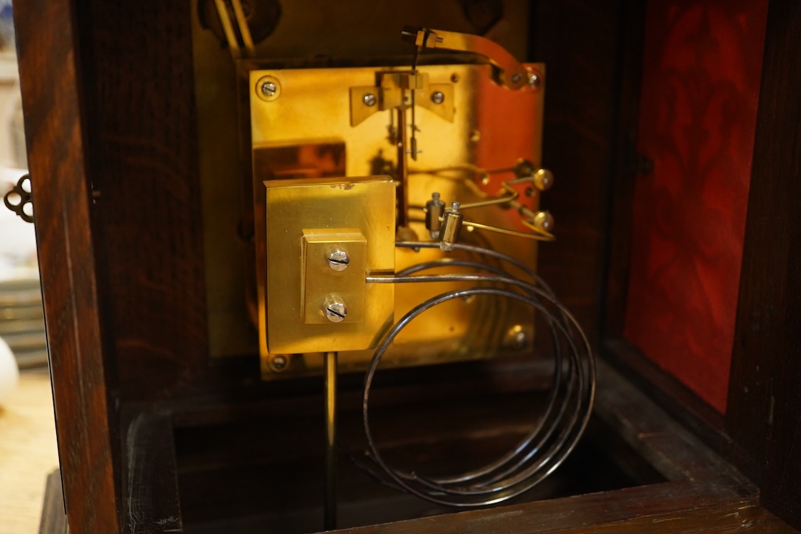 A mahogany 19th century German two train mantel clock, striking on two coiled gongs, 41cm high.