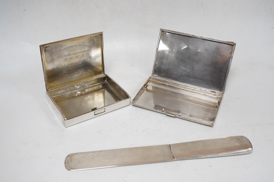An engine turned 800 standard white metal cigarette case, 12cm, a 1920's Russian 875 standard white metal cigarette case and a white metal paper knife or page turner.