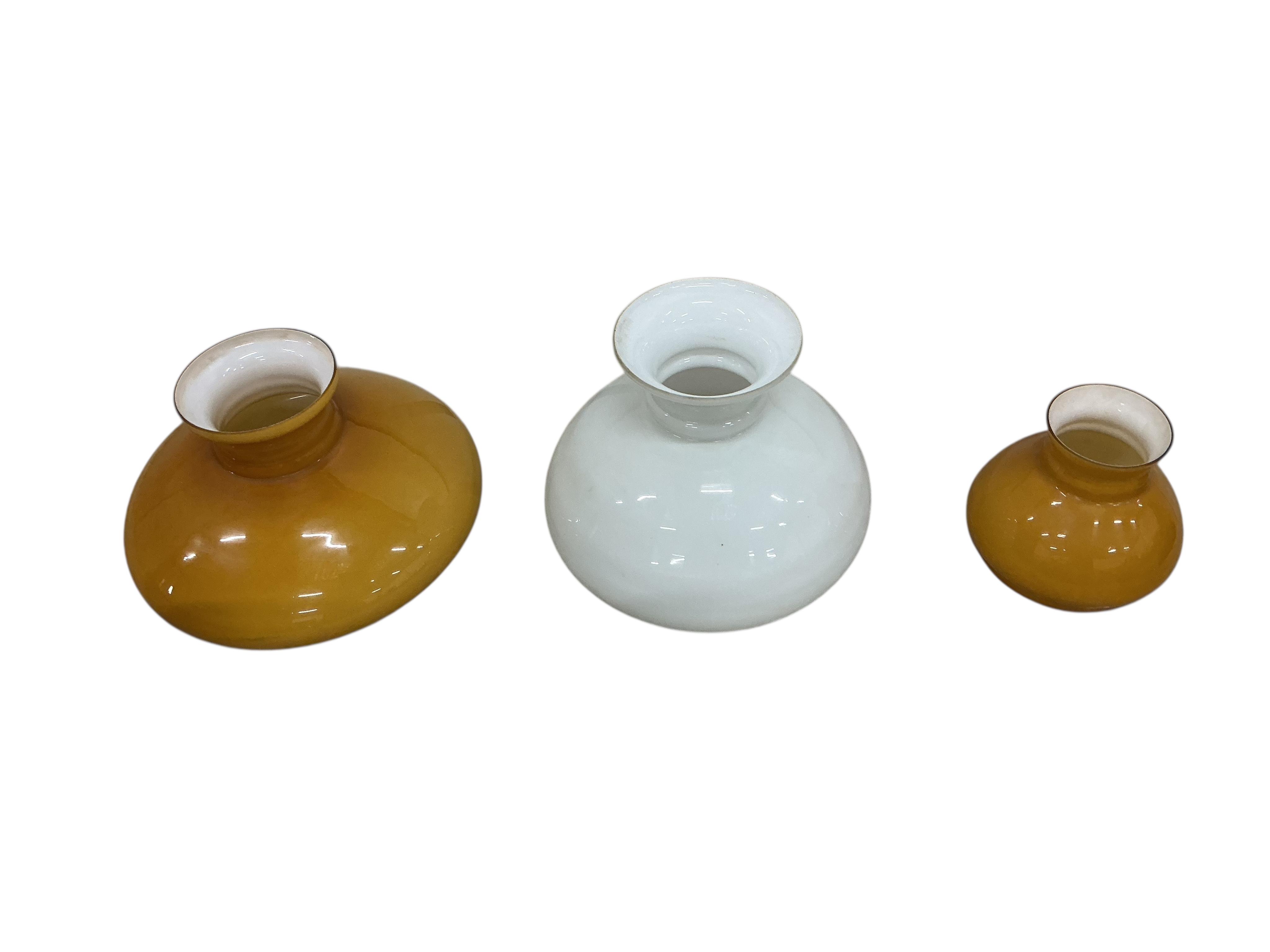 Lot 86 , A pair of late Victorian brass wall fitting gas lamps with odd shades (converted), and another electric wall light