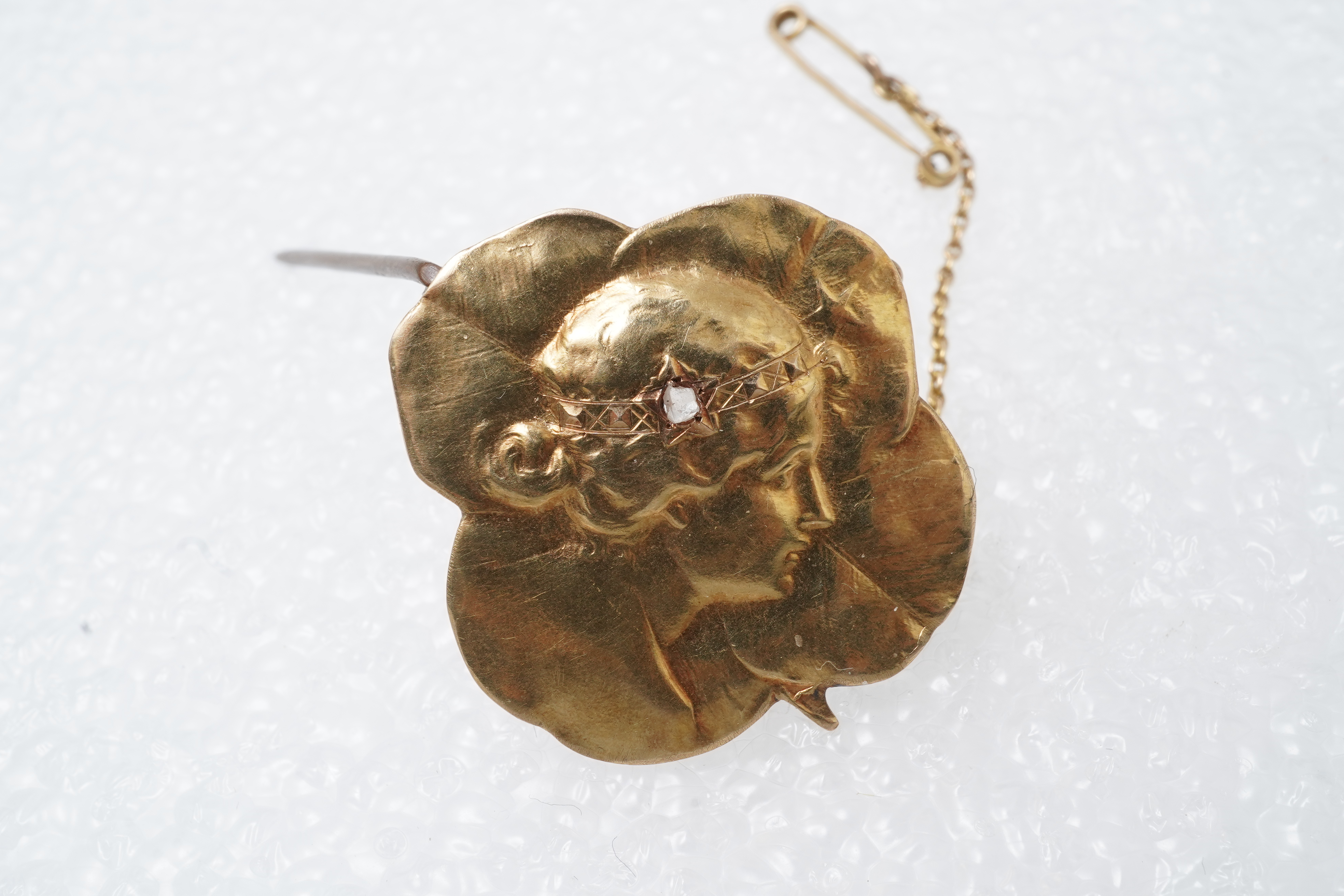 An Art Nouveau medallion brooch, early 20th century, designed as a woman in profile against a four leaf clover, accented with a rose-cut diamond, in gold, length 2.6cm, gross weight approximately 2.5 grams, base metal pin