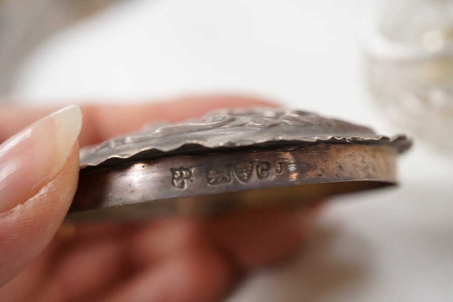 Lot 1855 , A pair of late Victorian silver mounted cut glass globular scent bottles, by C.C. May & Sons, Birmingham, 1898, height 11.8cm, together with three other silver mounted glass toilet jars and a pair of white metal overlaid
