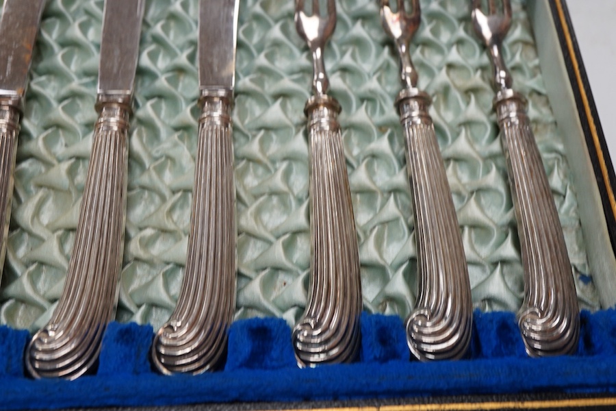 A cased set of six pairs of silver pistol handled dessert eaters, by James Dixon & Sons Ltd, Sheffield, 1905, knife 16.6cm.