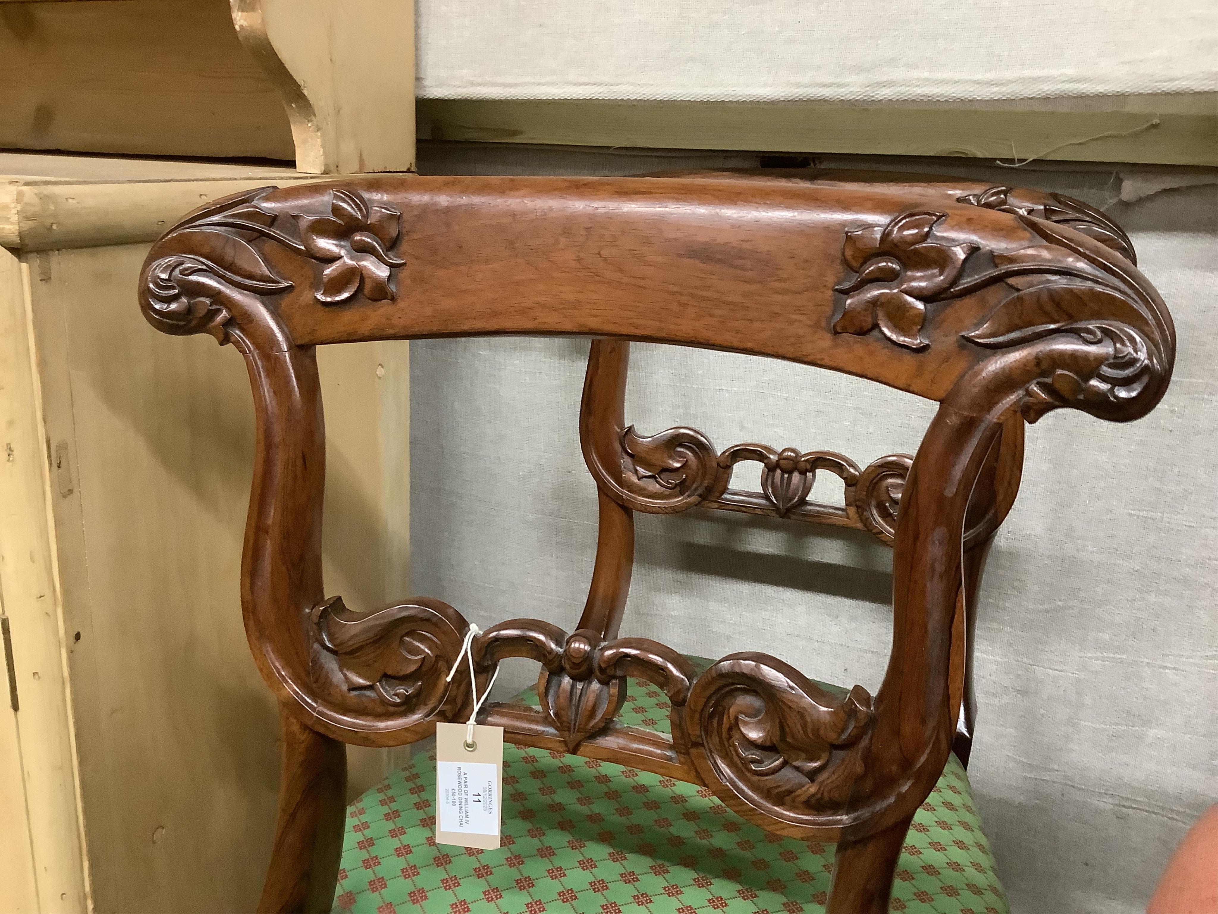 A pair of William IV rosewood dining chairs, with foliate carved decoration to the back supports, width 49cm, height 86cm