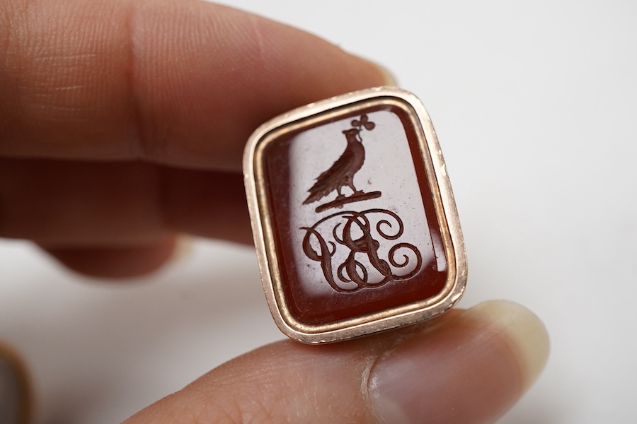 Three assorted 19th century yellow metal over laid fob seals, to include spinning set with three chalcedony stones, oval with white chalcedony carved with initials and rectangular with carnelian varved with a crest, largest approx. 30mm.