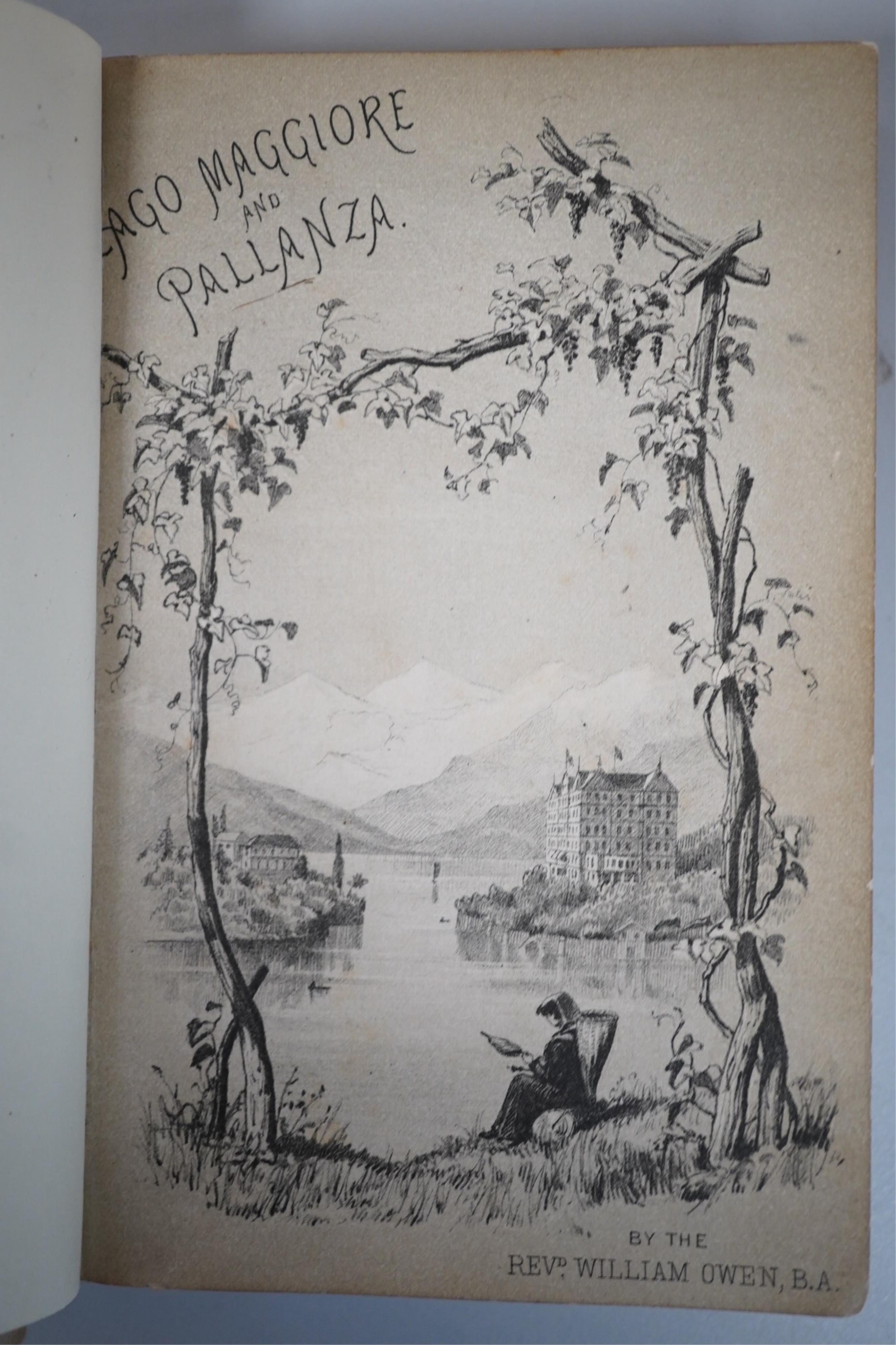 ° Owen, Rev. William - Sketches of Lago Maggiore and Pallanza. tinted lithographed pictorial and printed titles, an Extra Illustrated copy, with 17 fine watercolour sketches (unsigned) bound in throughout and 7 decorative coloured marginal illus; contemp. black blind-ruled calf, gilt titled on upper cover and plain panelled spine, ge. marbled e/ps., sm. cr. 8vo. (privately published) , Bickers & Son, 1879. * the author was English Chaplain at Pallanza, and apparently gave this copy to Mary Jane Morgan (a close friend, and the vendor's great grandmother) who was holidaying at this much favoured location when the book was published. At the same time Queen Victoria herself was staying at near by Villa Clara, Bareno with sketching as one of her holiday pursuits. She had met Owen Williams, and was presented with a vellum bound copy of the book (not immediately traceable in the Royal library at Windsor). Accompanying our copy are two notes written by Sir Henry Ponsonby, the Queen's private secretary, one reading (undated) "... has received the commands of Her Majesty the Queen to thank the Revd. W Owen for the volume which he has forwarded..."; the second, with another relevant message, is headed Villa Clara, April 22 1879. With the author unknown as an artist, and the book having no marks of ownership or other inscription, together with its very "workaday" binding, it is a somewhat intriguing story; perhaps further research may throw some light...(?)