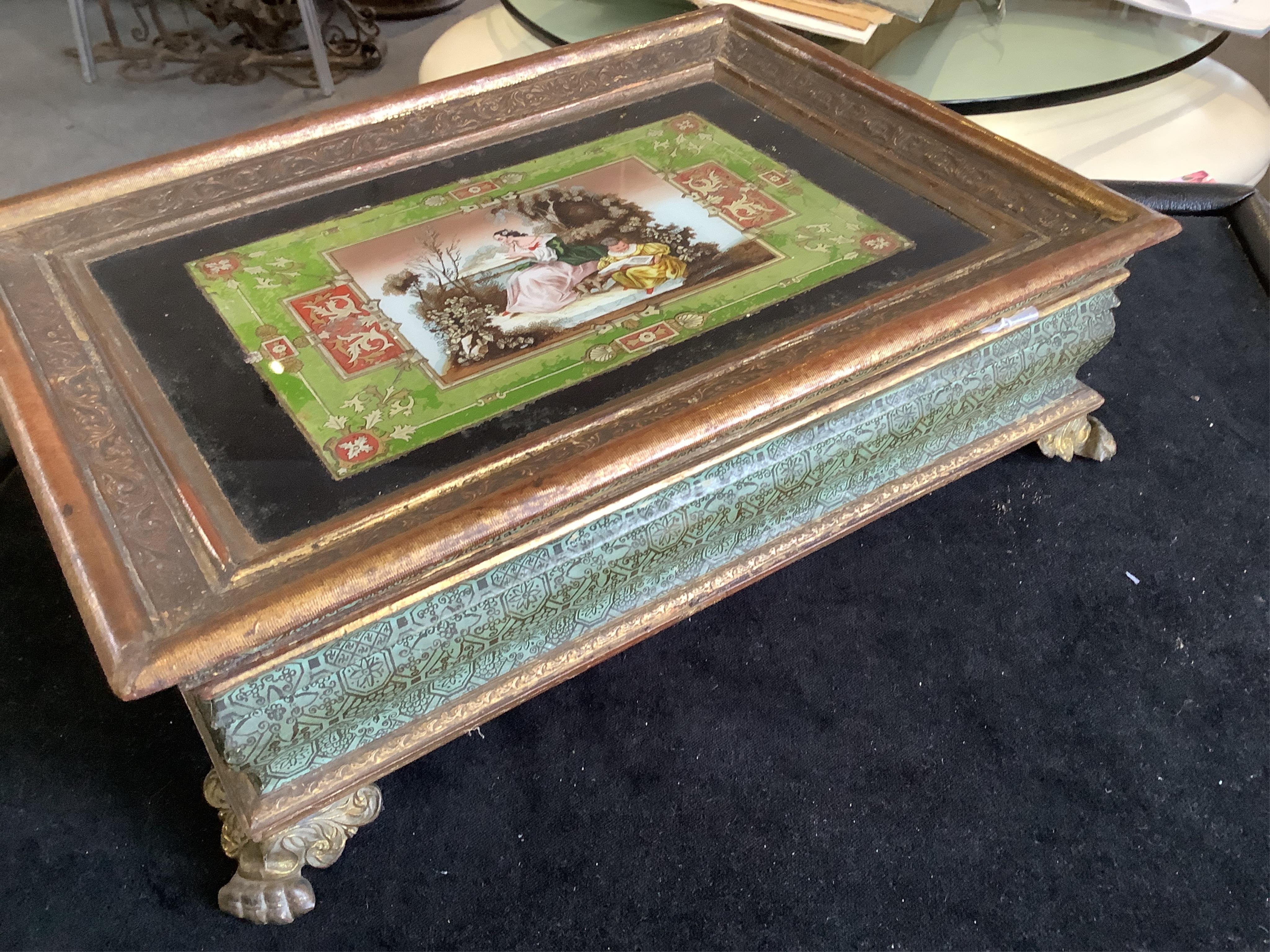 Acceptable signs of age and wear throughout. Verre eglomise print inset to top with craquelure and slight corrosion, image 5; wear to gilded frame, image 6; two embossed brass feet slightly insecure and need further pins; image 7; hinges working, interior with stains, both see image 9.