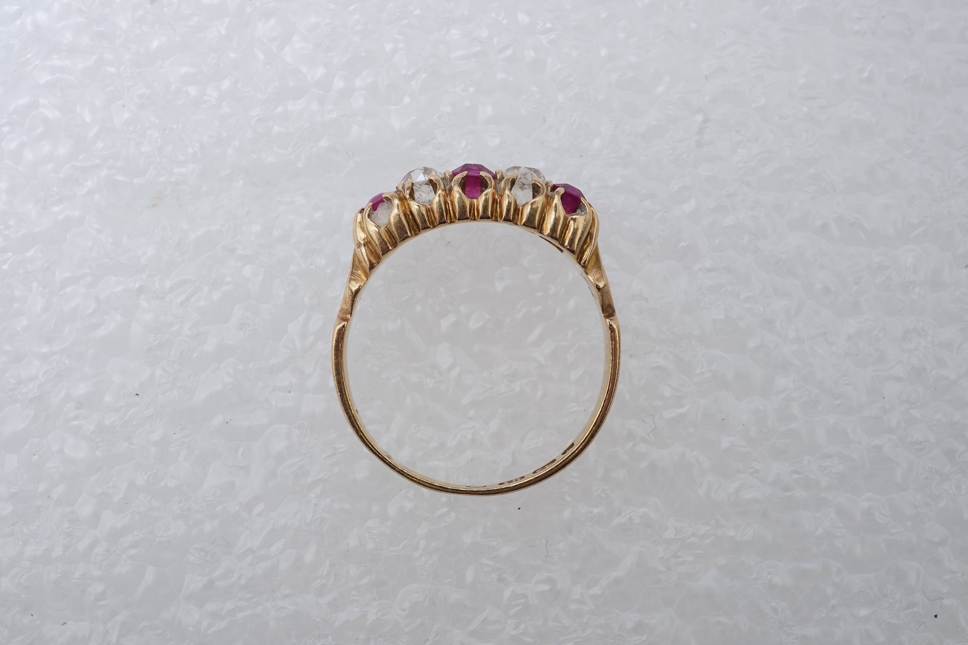 A Victorian ruby and diamond five-stone ring, circa 1884, claw-set with an alternating sequence of two diamonds totalling approximately 0.30 carats, and three rubies totalling approximately 0.40 carats, mounted in 18ct gold, size P, British hallmarks, numbered 76, gross weight approximately 4 grams