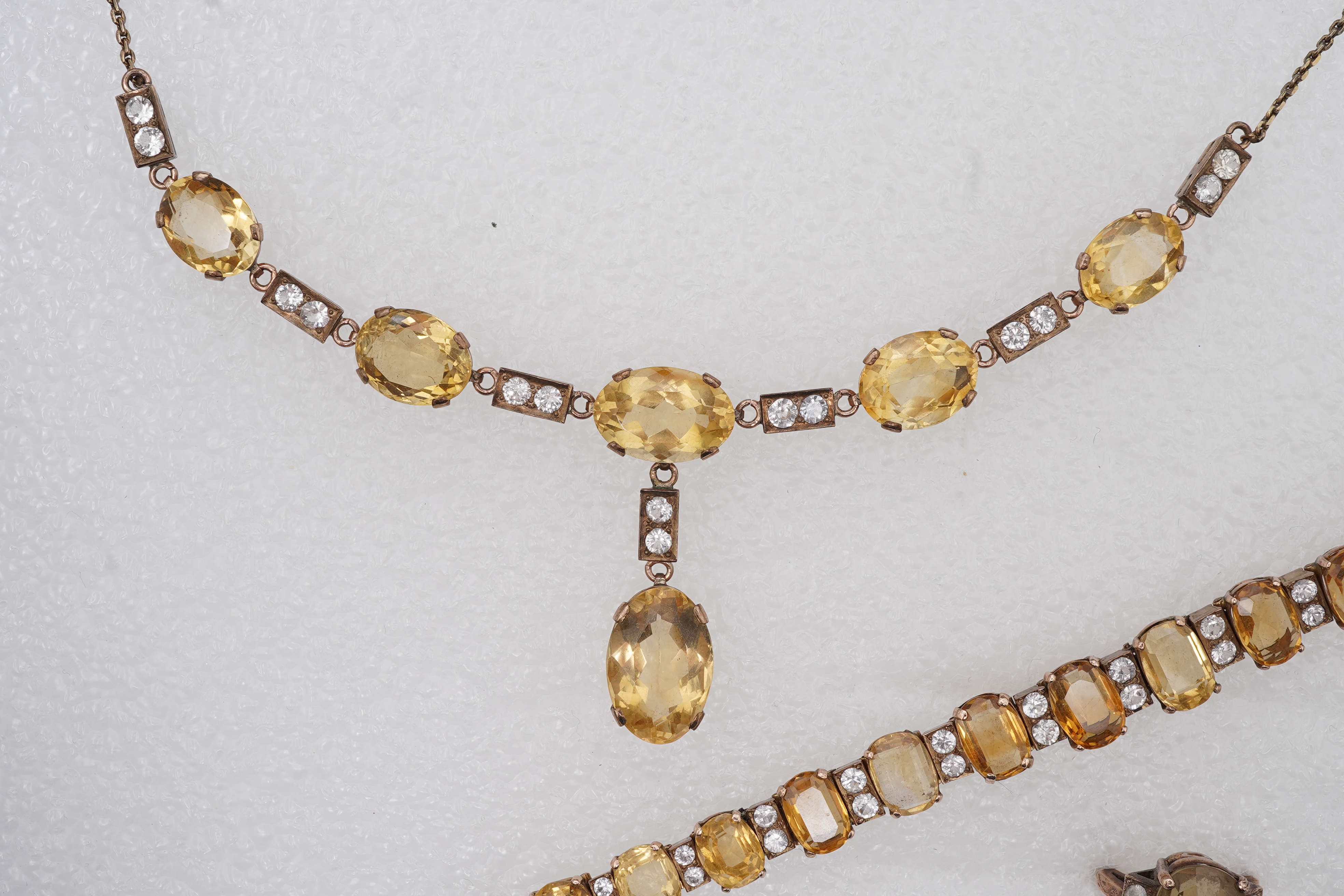 A citrine and white sapphire parure, comprising: a necklace, bracelet, ring and pair of earrings, each set with oval, step-cut or cushion-shaped citrines and circular-cut white sapphires, necklace 44cm, bracelet 17cm; ring size I, earrings 1.4cm, hook fittings, combined gross weight approximately 60 grams
