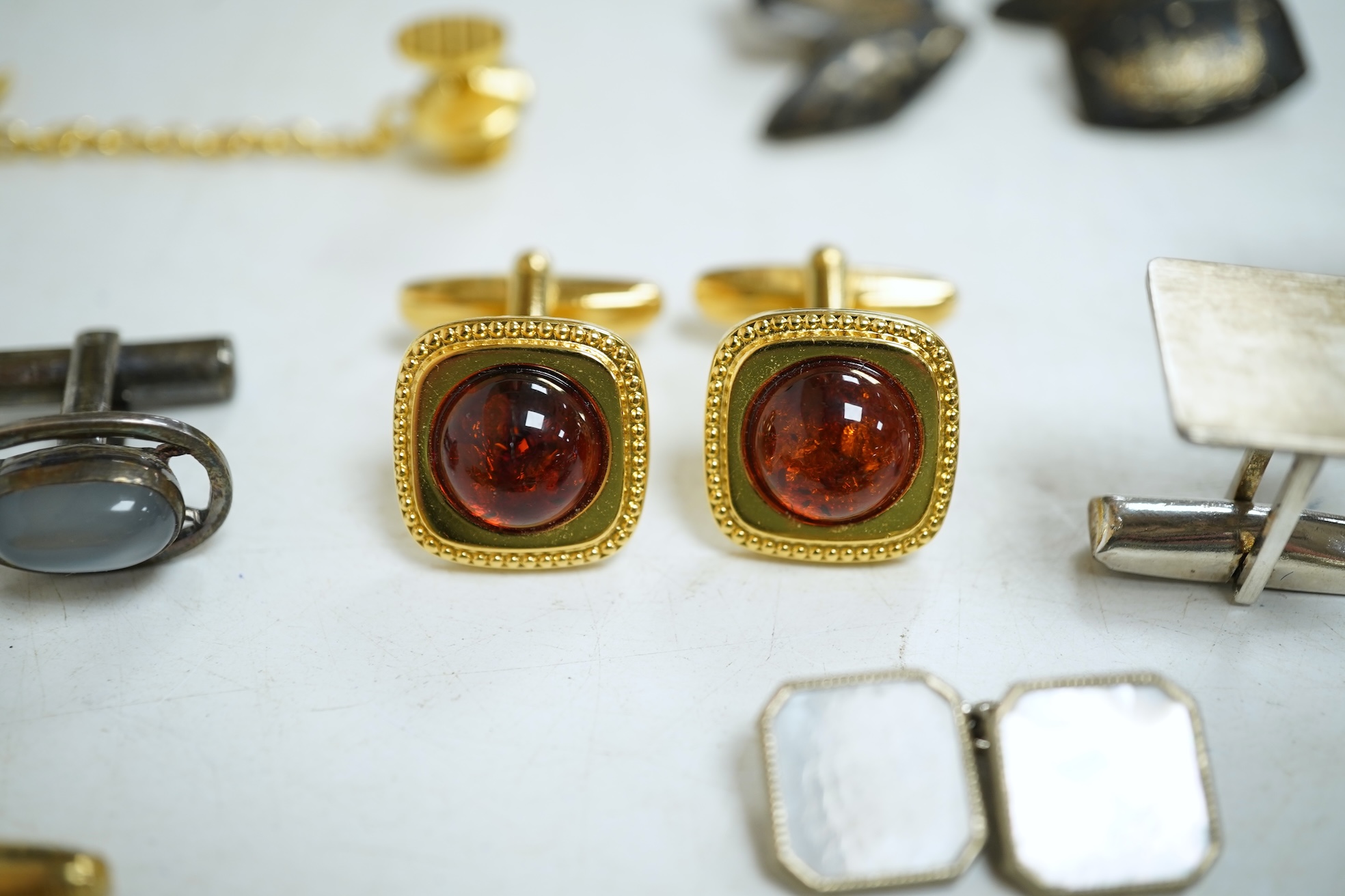 A collection of cufflinks, comprising: a pair of blue enamel and silver cufflinks; a pair of aventurine cufflinks; two pairs of Thai niello and silver cufflinks; a pair of moonstone cufflinks in a fitted case; and a quantity of cufflinks of various designs in gilt and bicoloured metal