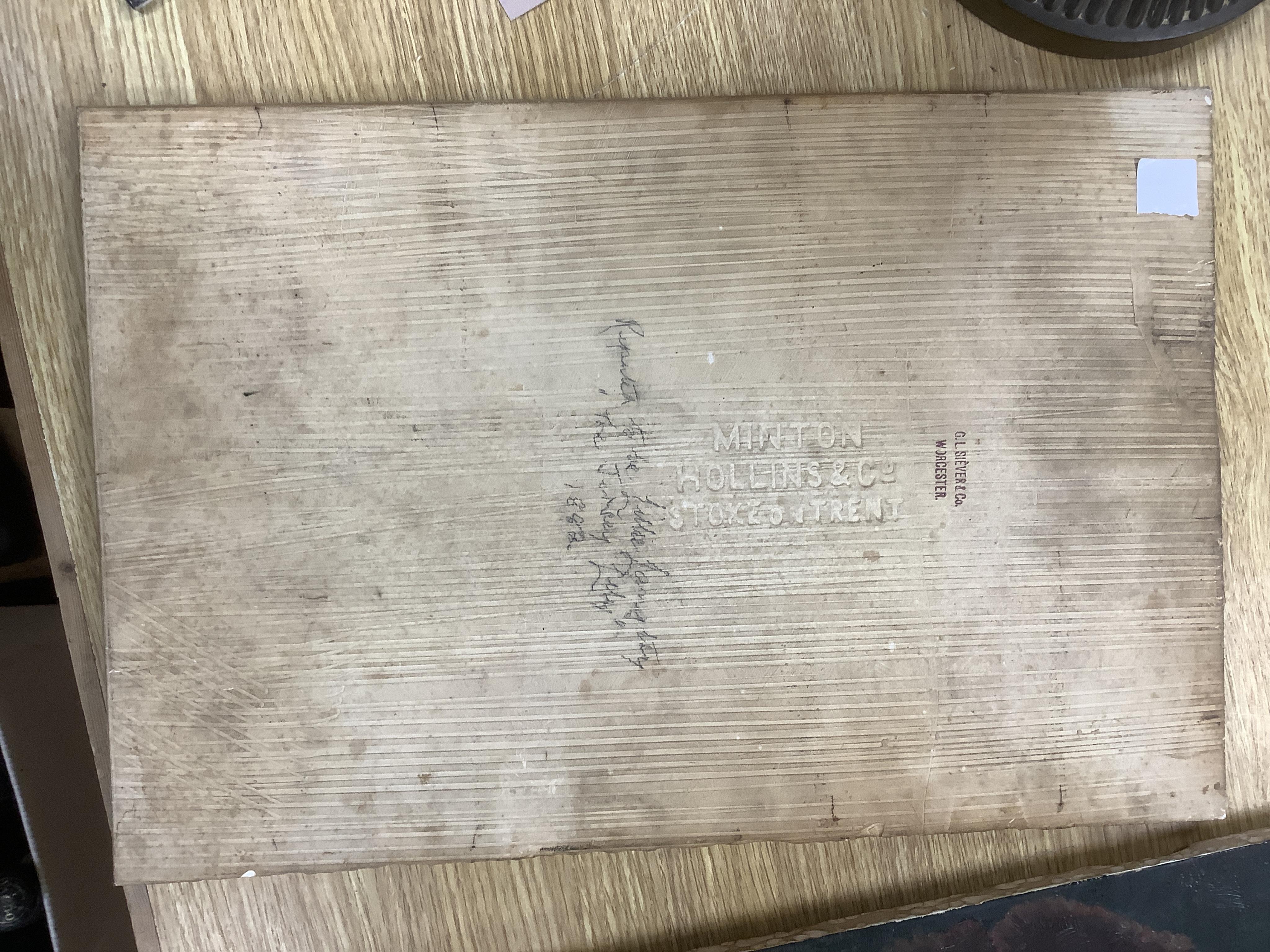 Female in green “reputed to be Lillie Langtry” both bottom corners with small chips; otherwise both structurally good; other female “reputed to be Sarah Bernhardt”. Both oil-painted, unglazed. Minton, Hollins & Co 1845-68. Retailed by GL Siever & Co., Worcester. Painter’s monogram SG unknown.