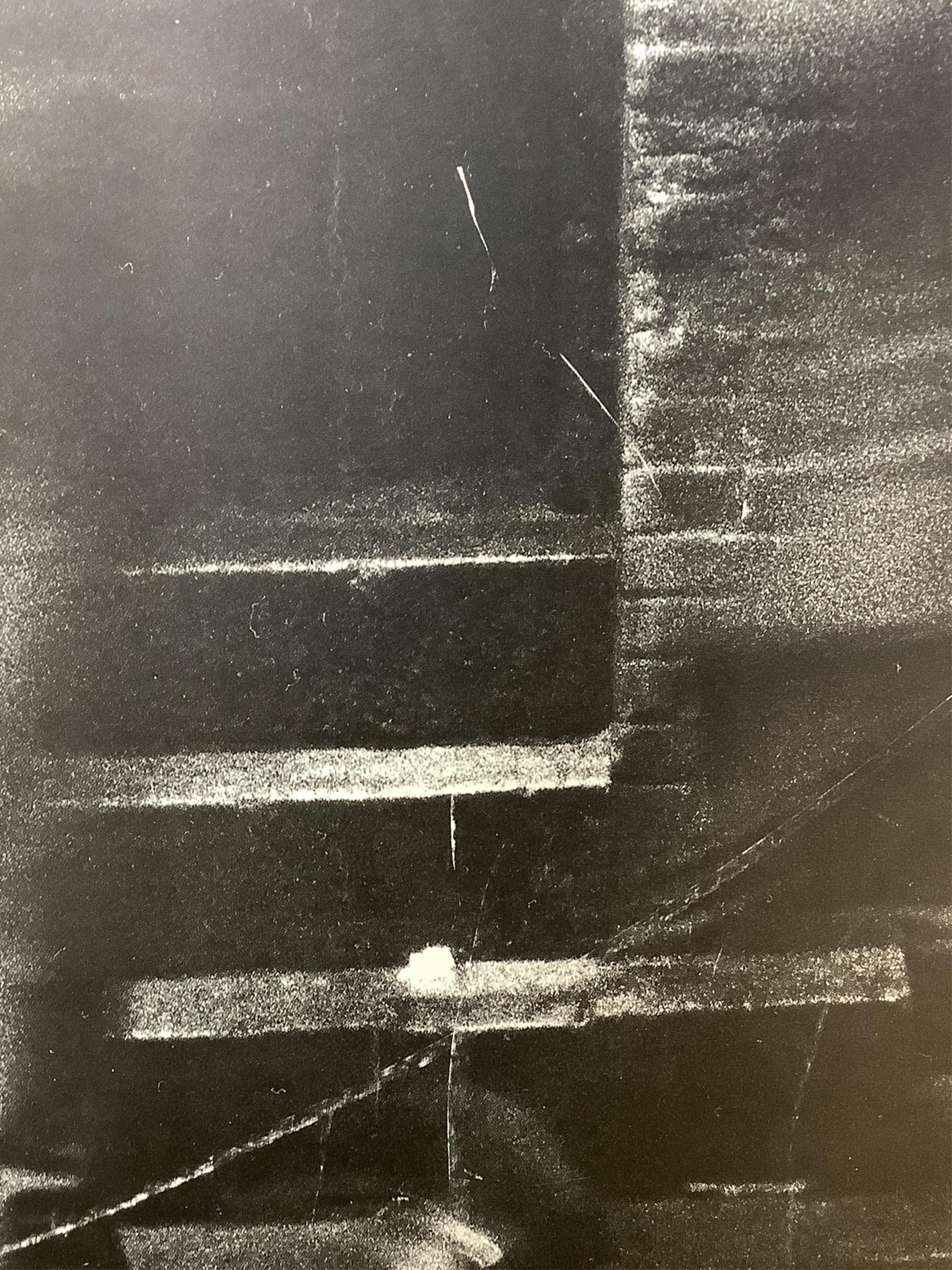 There appears to be a long arc of an apparent scratch at the lower area and scratches alongside the edge of the lower step corner. There are further apparent scratches, eg top-left and at the top-centre of the door. All of these scrapes seem to be printed.