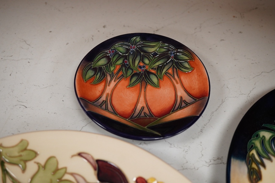Lot 1346 , Two Moorcroft plates comprising ‘Fantail’ and ‘Columbine’ pattern, together with three pin dishes, patterns, ‘Lily Plume’, ‘Panache’ and ‘New Forest’, largest 25cm in diameter