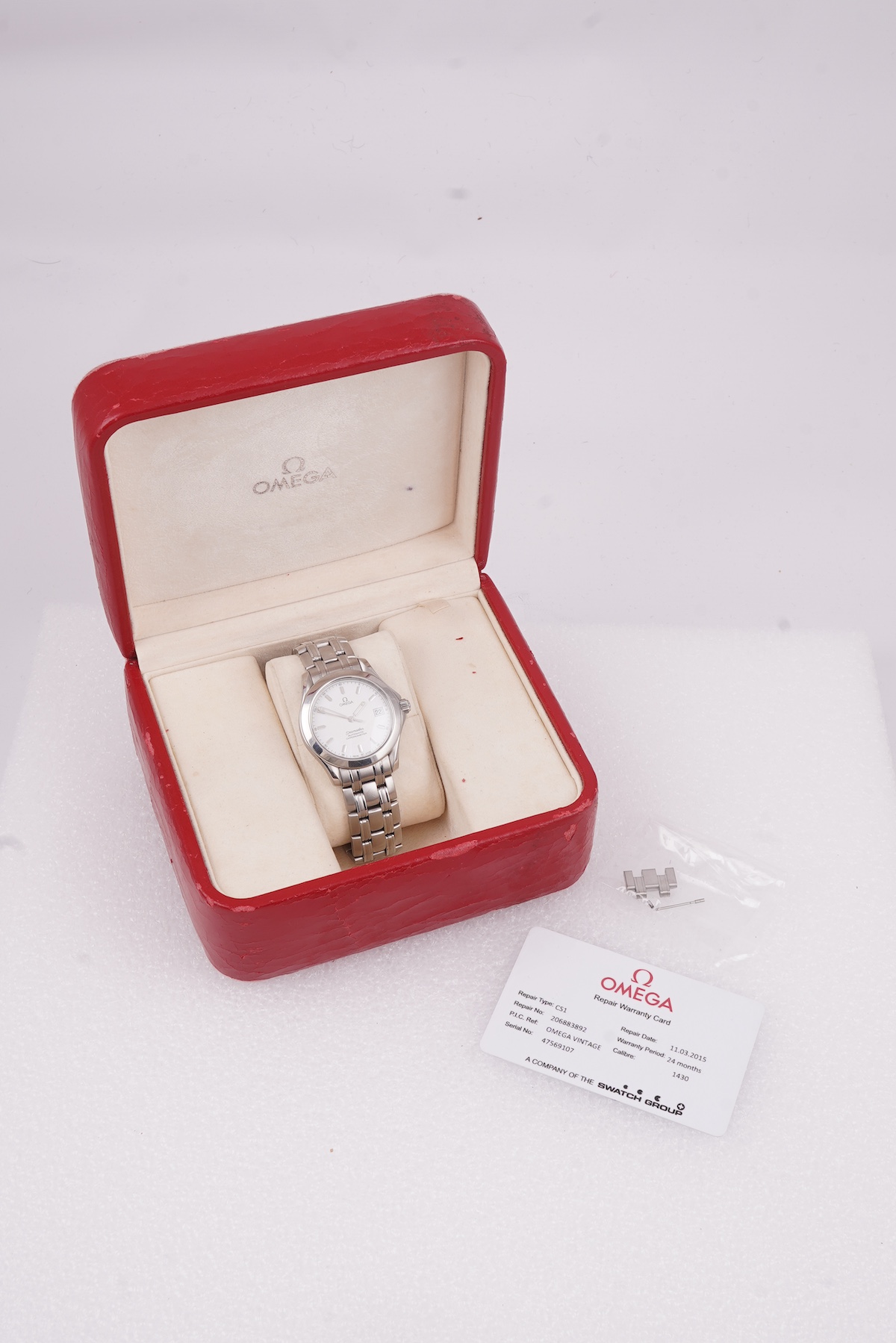 A gentleman's 2006 stainless steel Omega Seamaster Automatic Chronometer, with white dial and central wavy ground, baton numerals and date aperture, movement c.1120 serial number 80455726, case diameter approx. 35mm, on an Omega stainless steel bracelet, with Omega box, spare link.