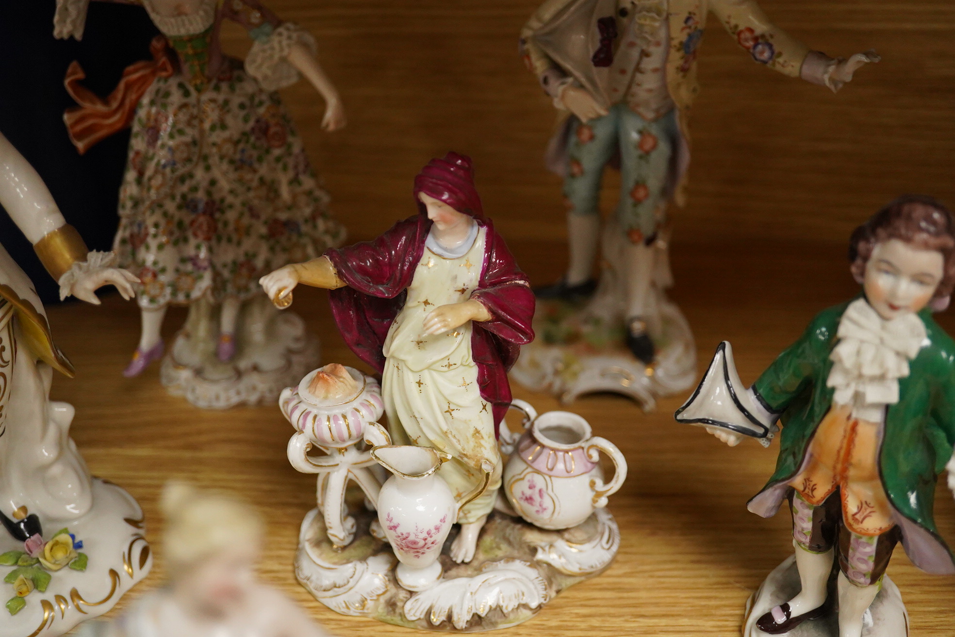 Nine continental figurines, to include Dresden porcelain lace examples, together with a resin figurine of Queen Elizabeth, largest 23cm high