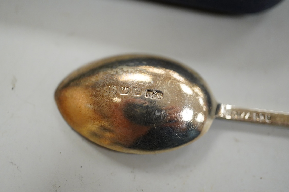 Lot 1827 , Two near matching cased sets of six silver and enamel coffee spoons, Turner & Simpson, Birmingham, 1936 and Mappin & Webb, Birmingham, 1932, 97mm.