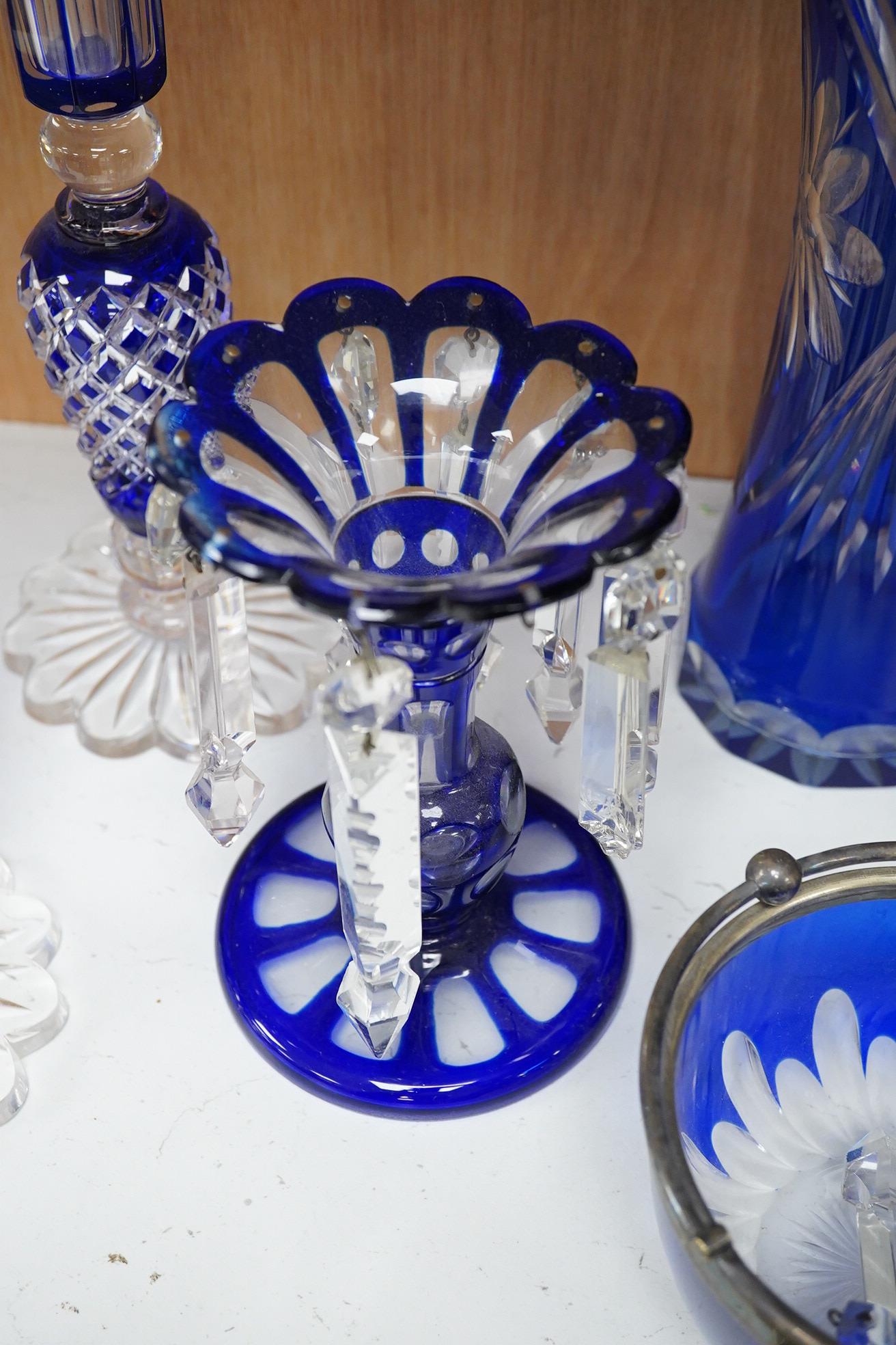 A pair of blue overlaid glass table lustres with drops and other blue overlaid glassware to include a pair of candlesticks and vases, largest 27cm high