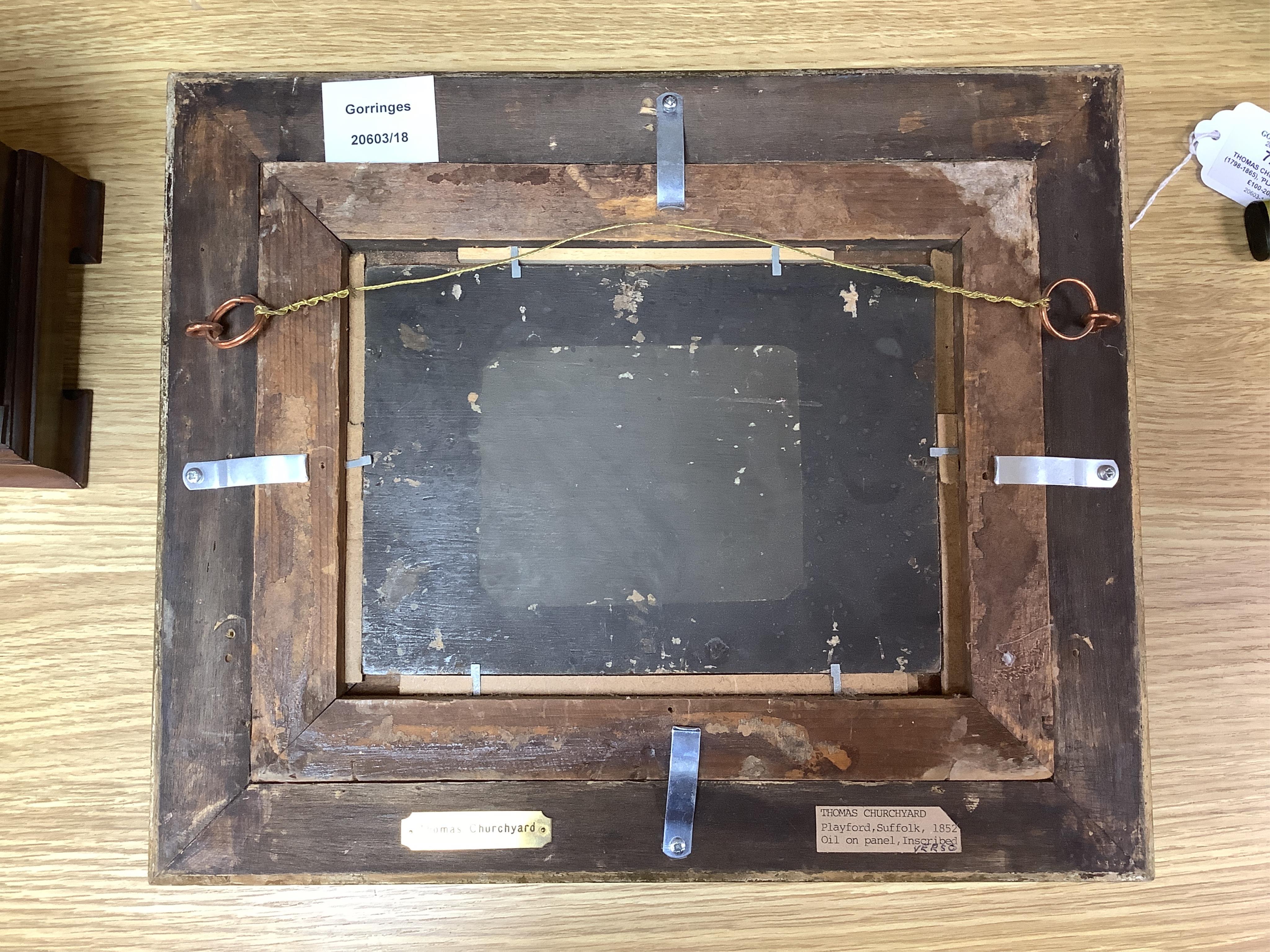 Lot 726 , Thomas Churchyard (1798-1865), ‘Playford, Suffolk’, unsigned, indistinctly inscribed verso and dated 1852?, oil on board, 14 x 19cm