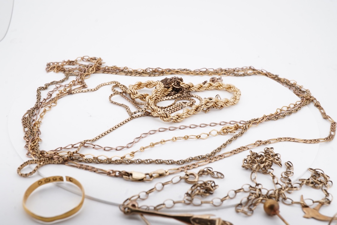 A collection of gold jewels, comprising: six 9ct gold chains and one bracelet, each with British hallmarks, total gross weight approximately 19.5 grams; a gold necklace, gross weight approximately 2 grams; a single earring designed as a swallow, stamped 9ct; a floral earring, British hallmarks, gross weight approximately 1 gram; a 22ct gold wedding band, British hallmarks, gross weight approximately 1 gram; and a gold stud, Italian maker's mark, stamped 750, gross weight 0.5 grams, some chains broken, wedding band split