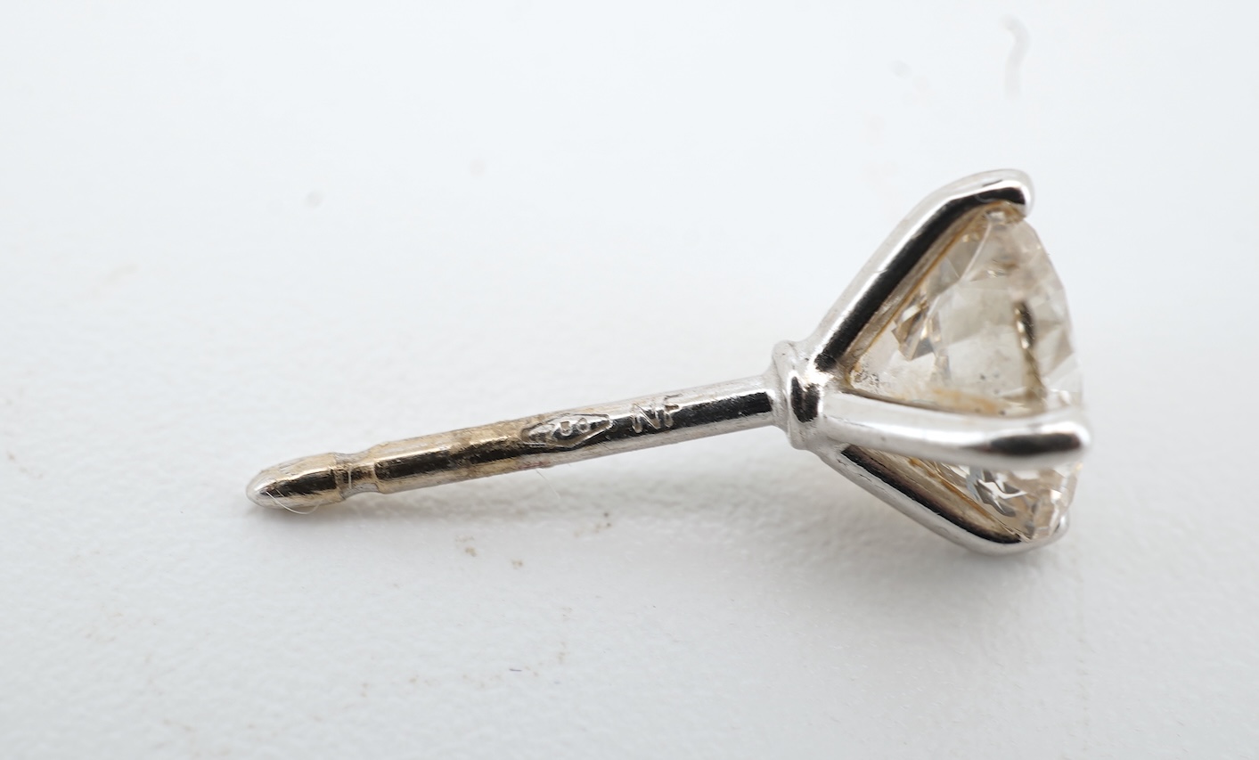 A pair of diamond stud earrings, each set with a brilliant-cut diamond weighing approximately 1.00 carat, estimated total diamond weight approximately 2.00 carats, mounted in white gold, post fittings, stamped 750