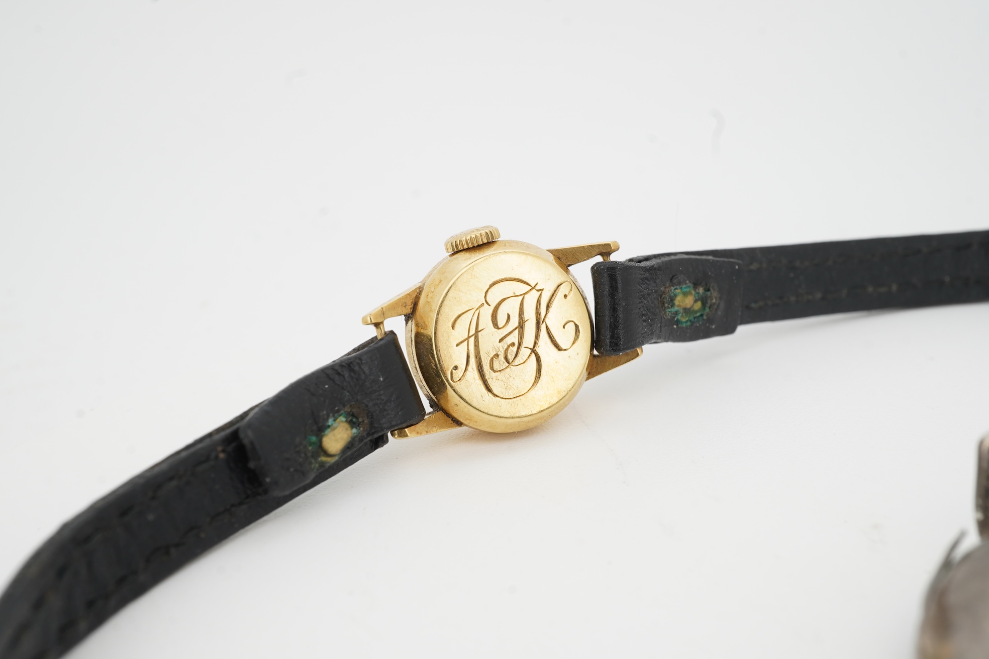 A lady's 18k Longines manual wind wrist watch, with baton and Arabic numerals, the case back with engraved initials, on an associated leather strap, together with a 935 standard white metal wrist watch(a.f.).