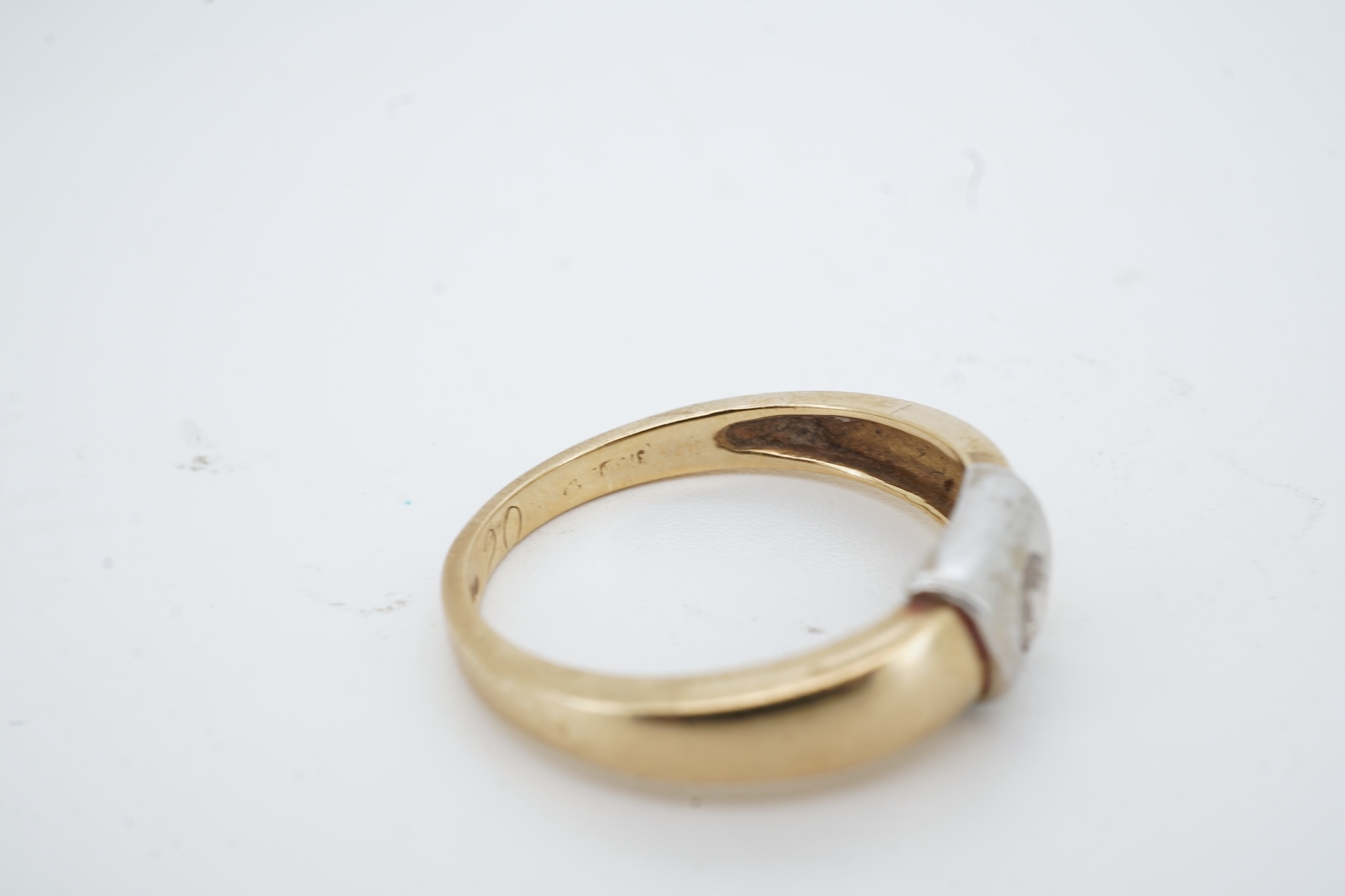 A diamond ring, rubover-set with a circular-cut diamond weighing approximately 0.10 carats, mounted in bicoloured 9ct gold, size O, British hallmarks, gross weight approximately 2.5 grams