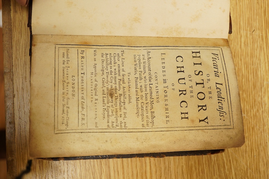 ° Fosbrooke, Rev. Thomas Dudley - An Original History of the City of Gloucester... including also the original papers of the late Ralph Bigland... engraved pictorial and printed titles, plan and num. plates; late 19th cent. half morocco and cloth, gilt panelled spine, 4to. 1819; Nicholson, Joseph and Burn, Richard - The History and Antiquities of the Counties of Westmoreland and Cumberland. vol.1 (only of 2). folded Westmorland map, engraved plates; contemp. gilt diced calf, panelled spine, marbled edges and e/ps; roy. 4to 1777; Thoresby, ralph - Vicaria Leodiensis: or, the History of the Church of Leedes in Yorkshire...folded plate, text decorations; contemp. calf (rebacked panelled spine with maroon label), cr.8vo. 1724 (3)