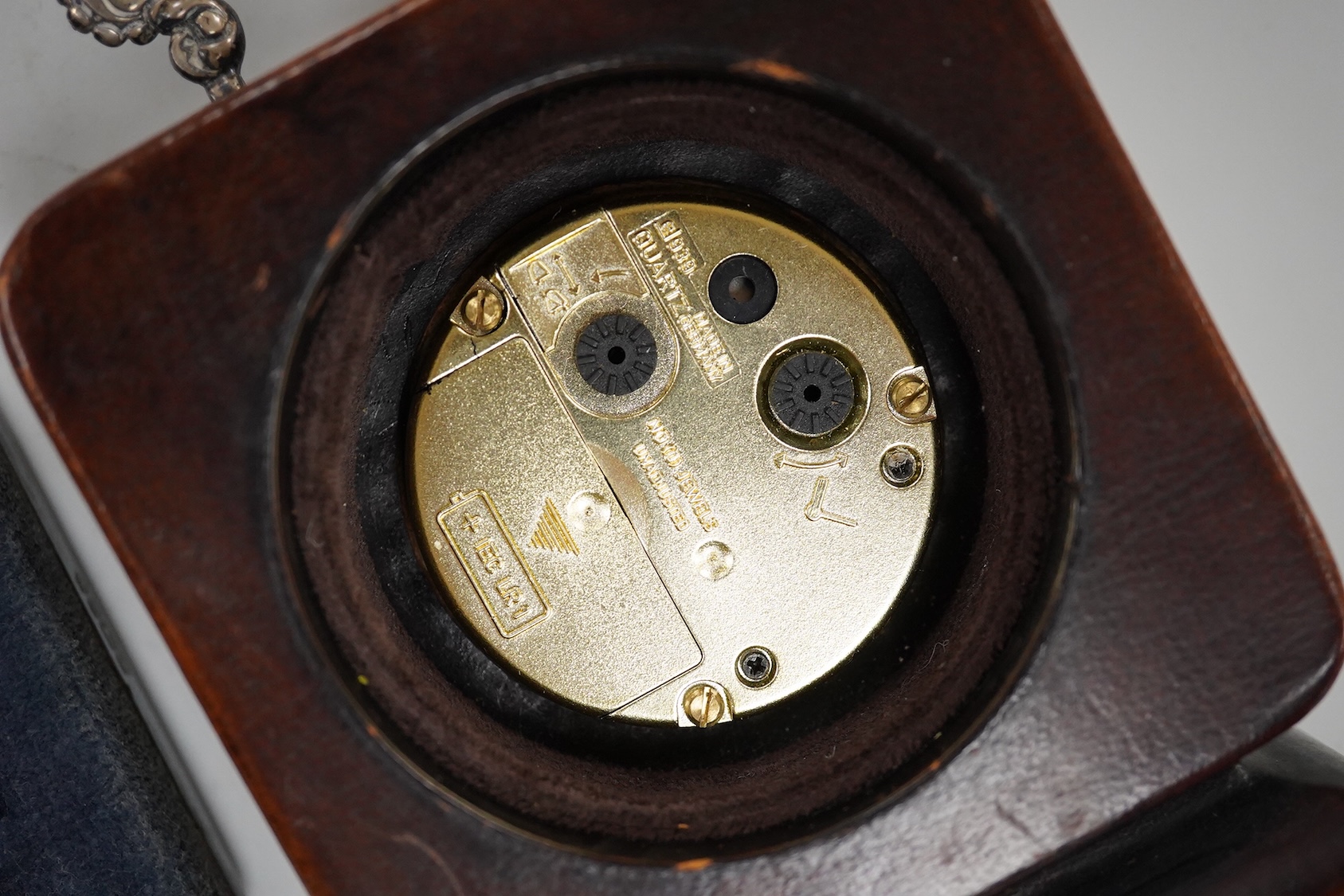 Two modern silver or 925 mounted desk timepieces including Italian, largest 85mm and a set of three Elizabeth II silver wine labels, Turner & Simpson, Birmingham, 1966.