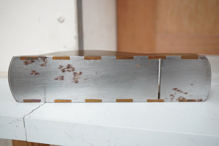 Lot 1009 , An unmarked dovetailed adjustable block plane with gunmetal sides and steel sole, rosewood and steel wedge and rosewood front grip, and fitted with a 1 1/2” iron, the sole 19.3cm