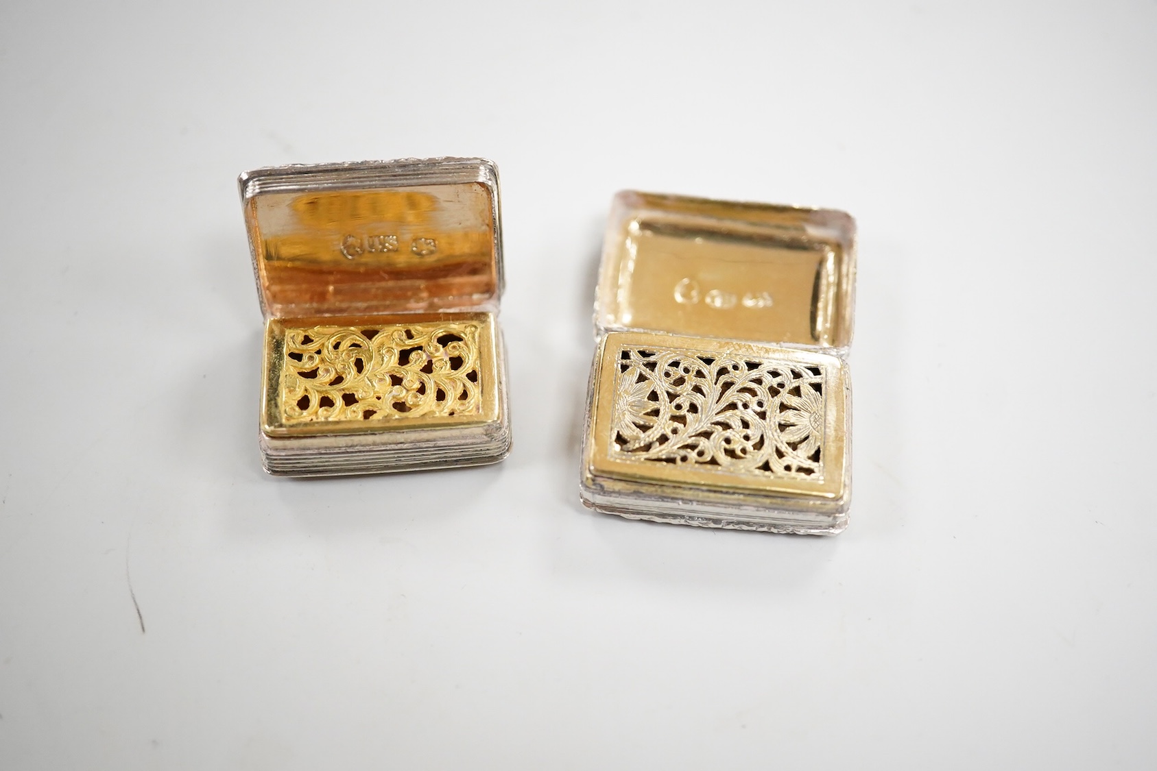 A George IV engraved silver rectangular vinaigrette, John Bettridge, Birmingham, 1827 and a William IV silver vinaigrette, maker TS, Birmingham, 1832.