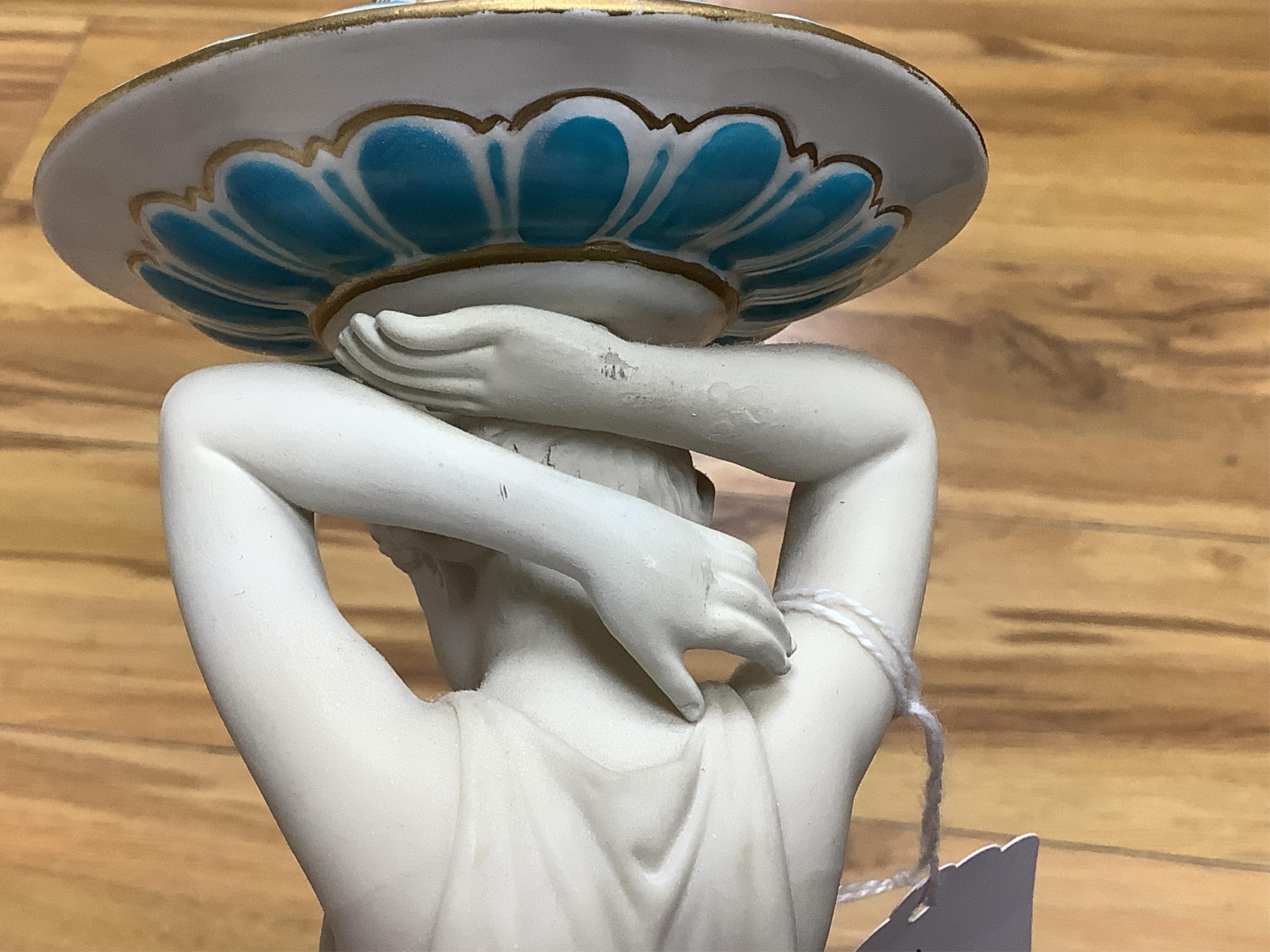 A pair of Victorian glazed and bisque porcelain figural candlesticks, 34cm high