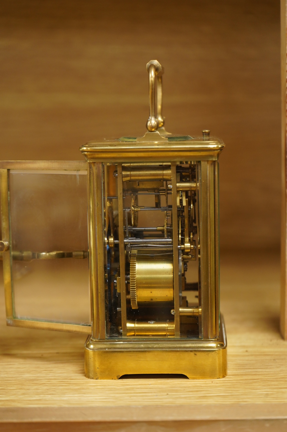 A French brass carriage clock with gong-striking movement, with key, in original leather case