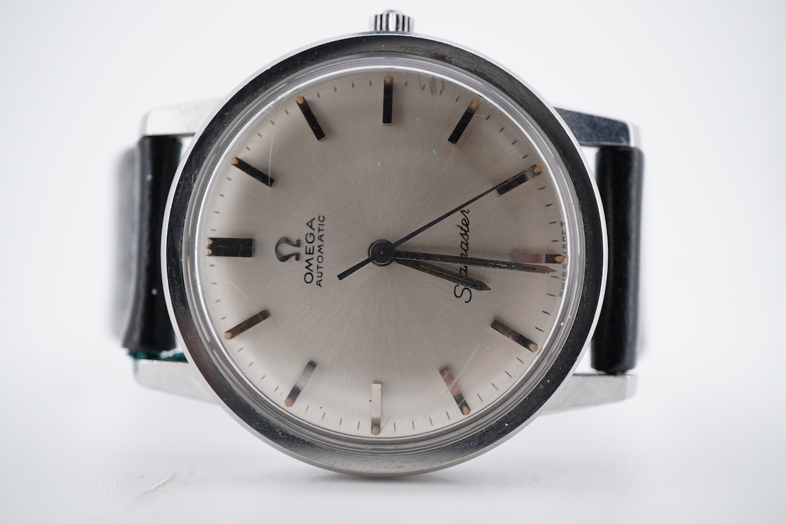 A gentleman's early 1980's steel and gold plated Omega Seamaster quartz wrist watch, with baton numerals and date aperture, movement c.1337, case diameter 33mm, on an associated flexible bracelet.