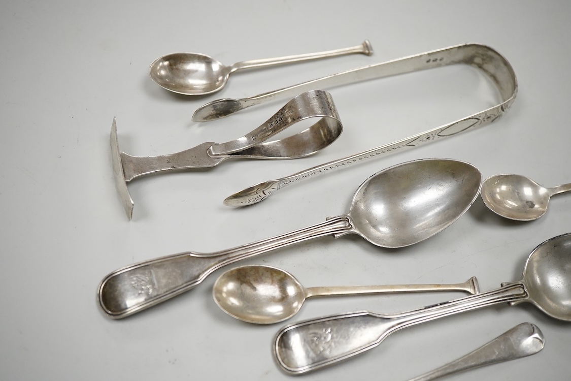 Fifteen items of sundry silver flatware, to include a George III bright cut engraved table spoon, John Bayly, Dublin, 1805, a set of six George V coffee spoons, three teaspoons, a mustard ladle, a dessert spoon, a pair of George III sugar tongs, Soloman Hougham, London, 1797, a damaged spoon and a pusher.