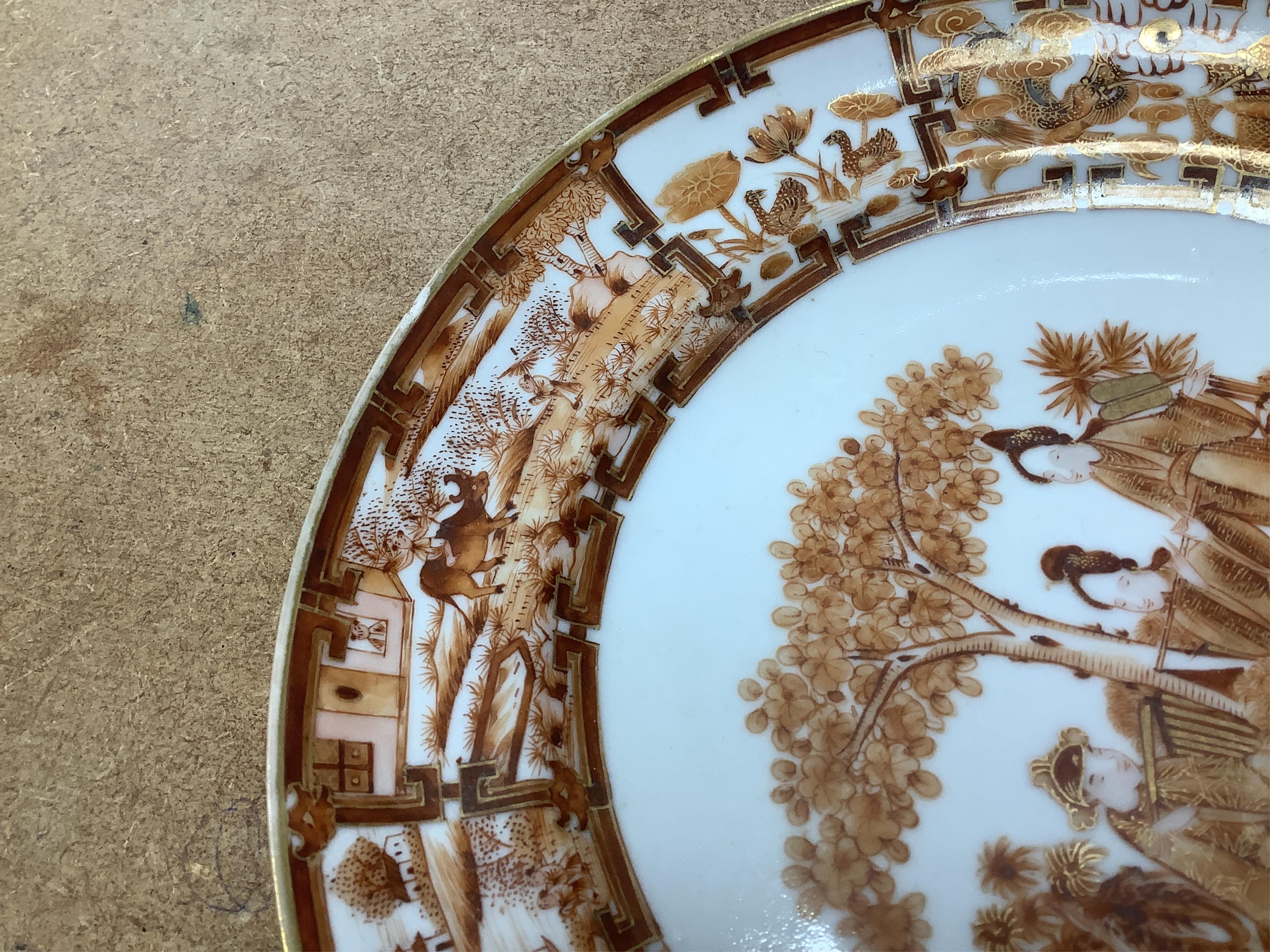 One plate rim chipped, approx. 8x2mm; three further smaller rim-chips, images 4 and 5. One plate with small, shallow rim-chip, image 6. Other plate good. All with some surface wear and wear to gilding. No hairline cracks.