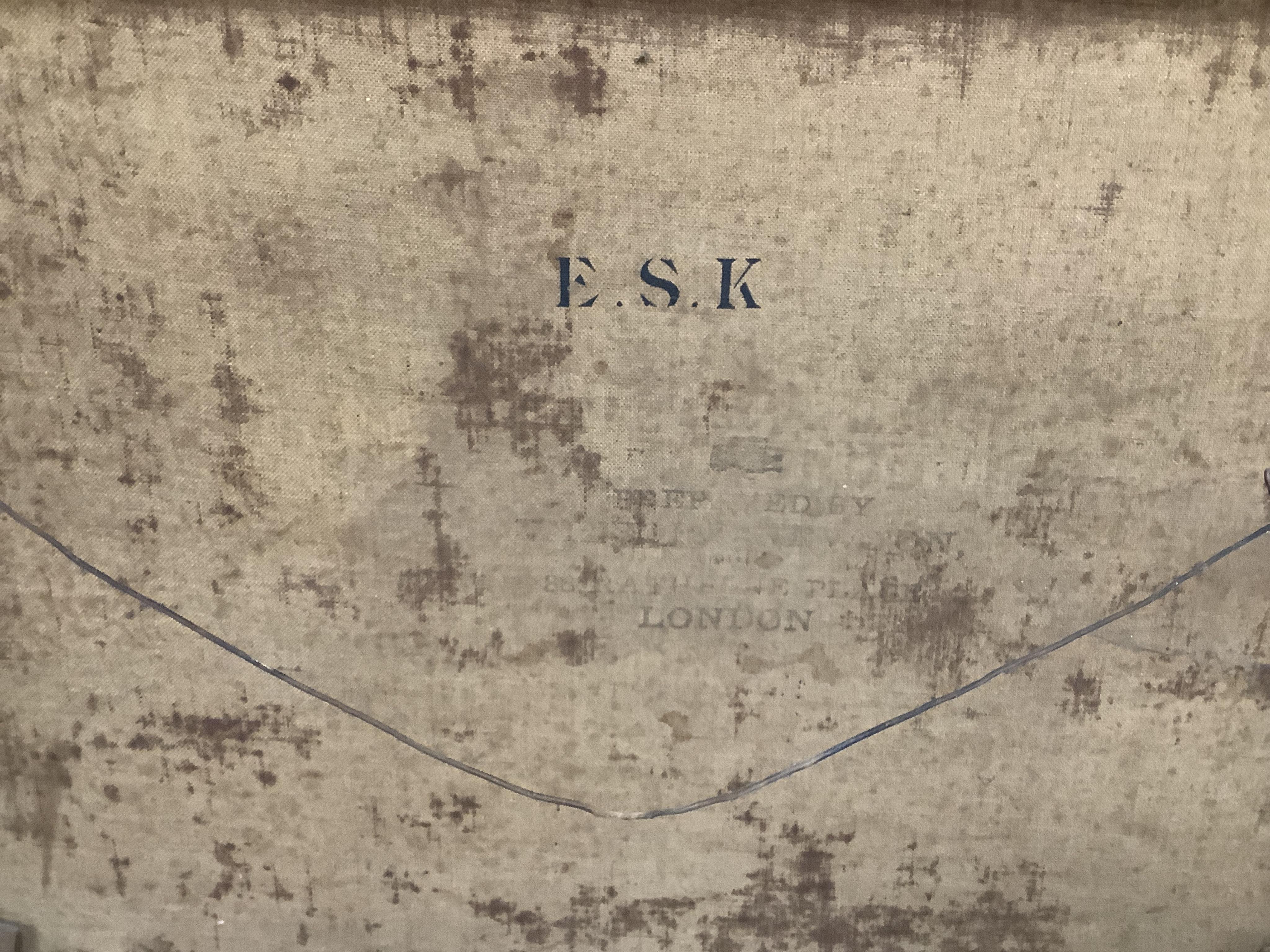 Canvas dirty with a series of white spots clearly visible against the dark ground; hand-written label verso; signed lower-right and, less clearly, lower-left. Frame with a series of missing sections.