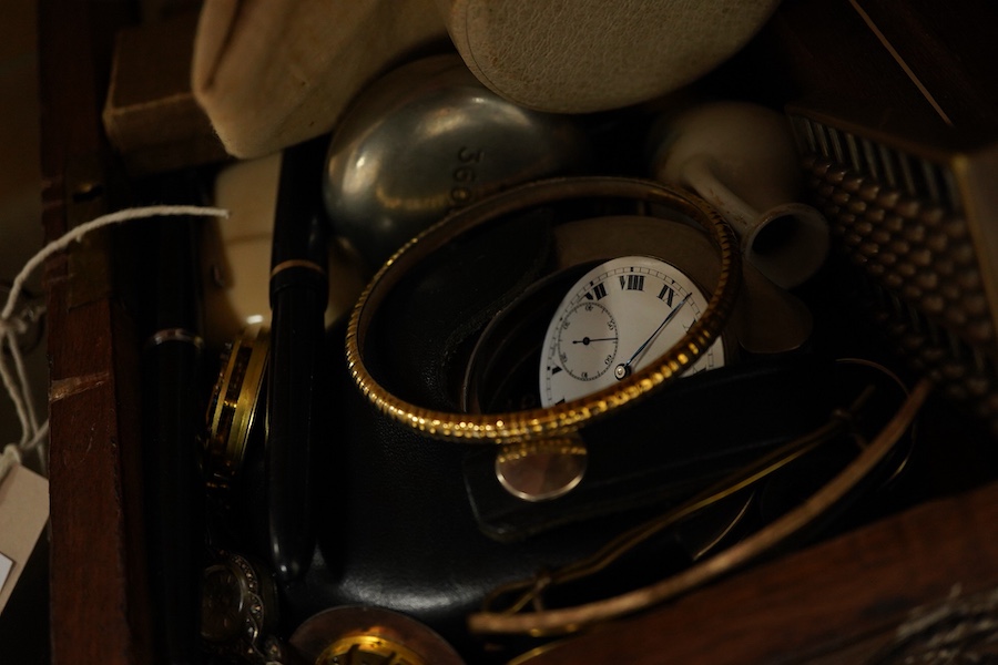 Lot 430 , Collectables including a Britains boxed Coronation Chair, silver baby-rattle, white metal scent flask, bosun’s whistle, Queen Victoria horse-brass and two Parker fountain pens, contained within two wood boxes