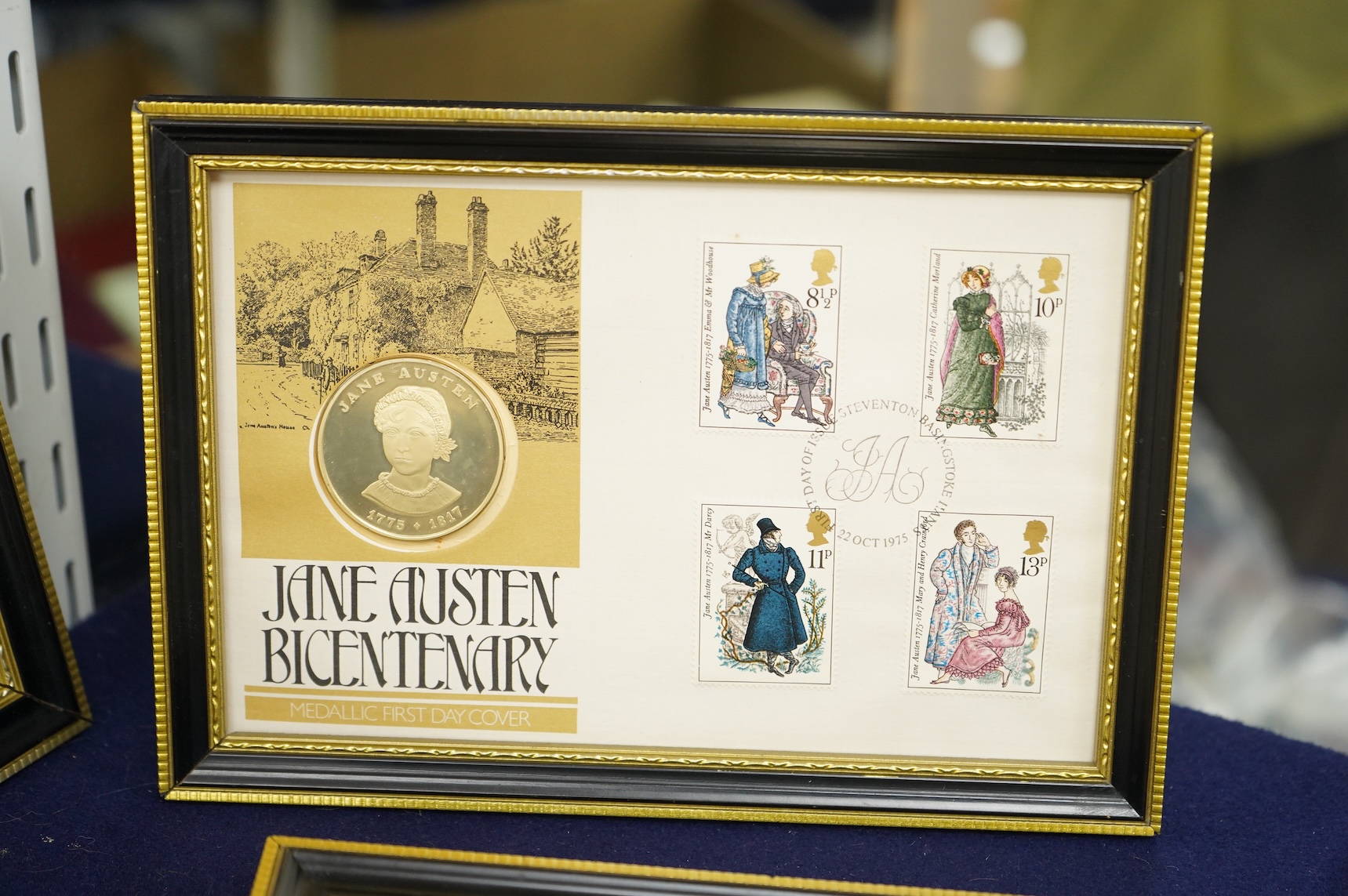 Lot 410 , A set of six Jane Austen commemorative silver plaques, purchased in 1975 for the Bicentenary of her birth, all six of her novels depicted, and a related silver-gilt medal with certificate of Authenticity, plaques 10x7cm