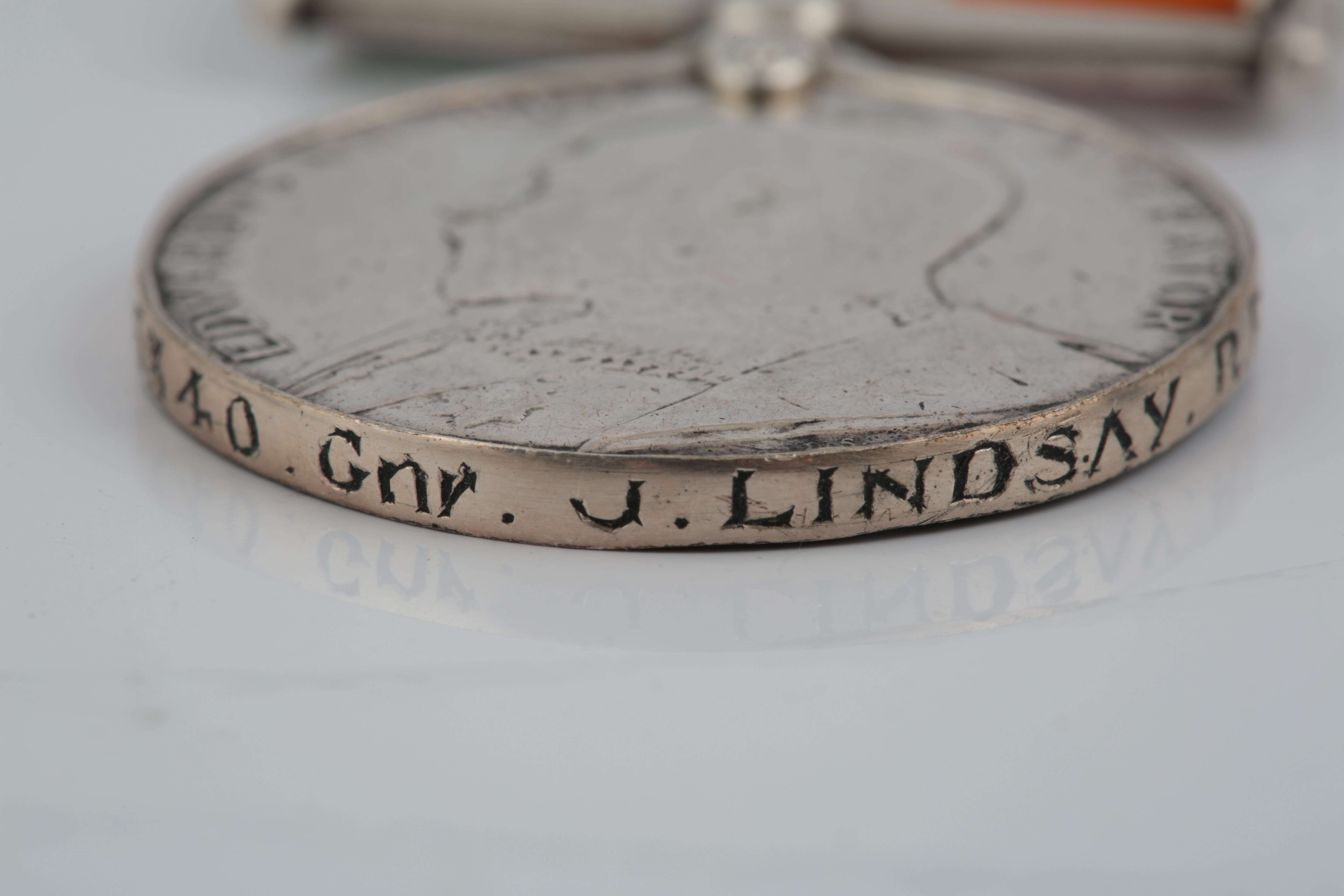 Five Victoria and Edward VII medals; a South Africa medal pair awarded to 83840. GNR. J. Lindsay. R.F.A.; comprising of a Queen’s South Africa medal with clasps for Orange Free State, South Africa 1902, Cape Colony, and Transvaal, and a King’s South Africa medal with clasps for South Africa 1901 and South Africa 1902, (both renamed)