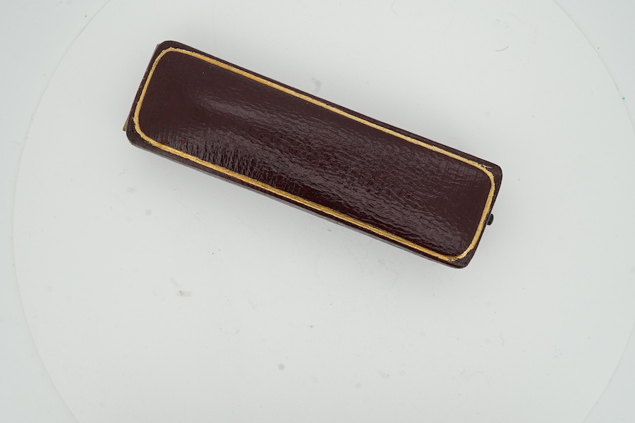 Lot 930 , An Edwardian yellow metal and seed pearl cluster set stick pin, the terminal modelled as a baton through a hoop, 51mm, in original box.
