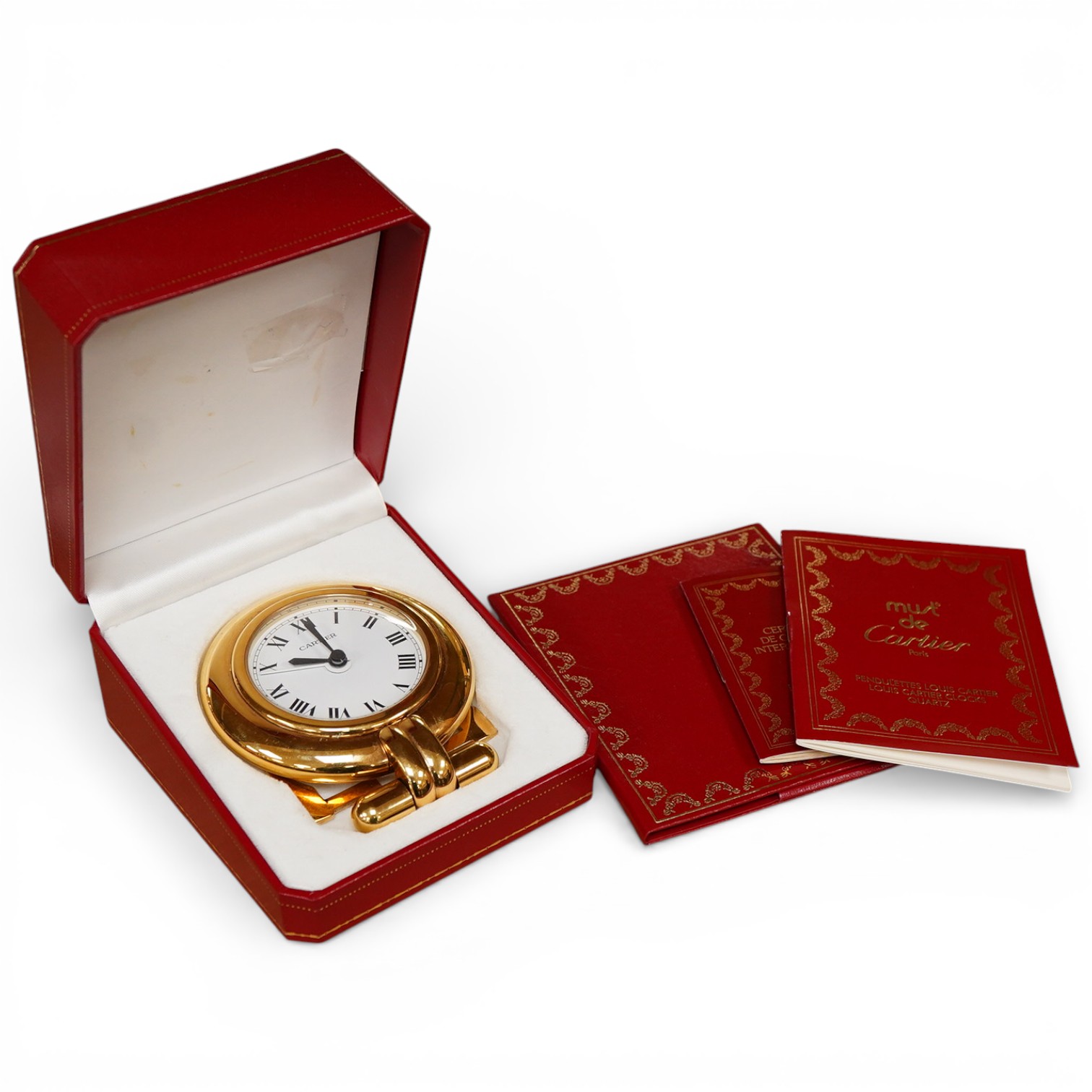 A cased Cartier gilt metal travelling timepiece, numbered 0520291, with case, booklet and instruction manuel