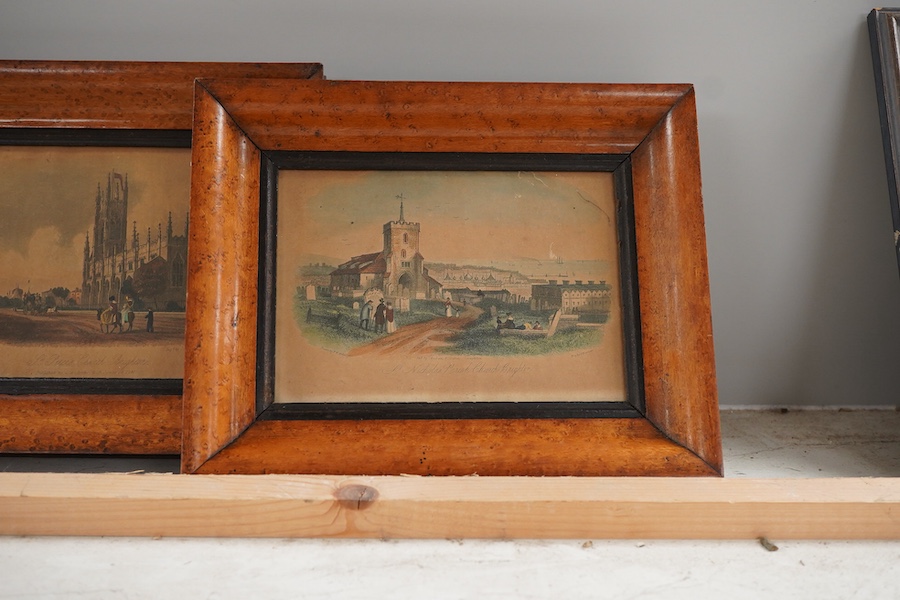 19th century, 'St Peter's Church' and 'St Nicholas Paris Church', pair of Brighton interest prints, both maple framed, 11.5 x 16.5cm