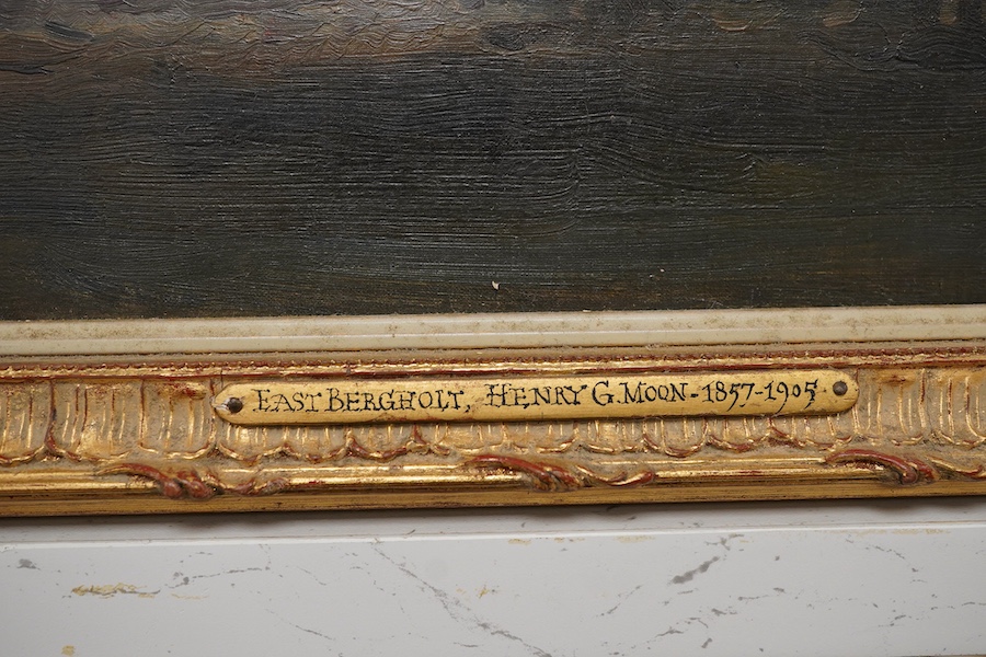 Henry G. Moon (1857-1905), oil on board, Moonlit landscape, unsigned, 33 x 23cm, applied plaque to the gilt frame